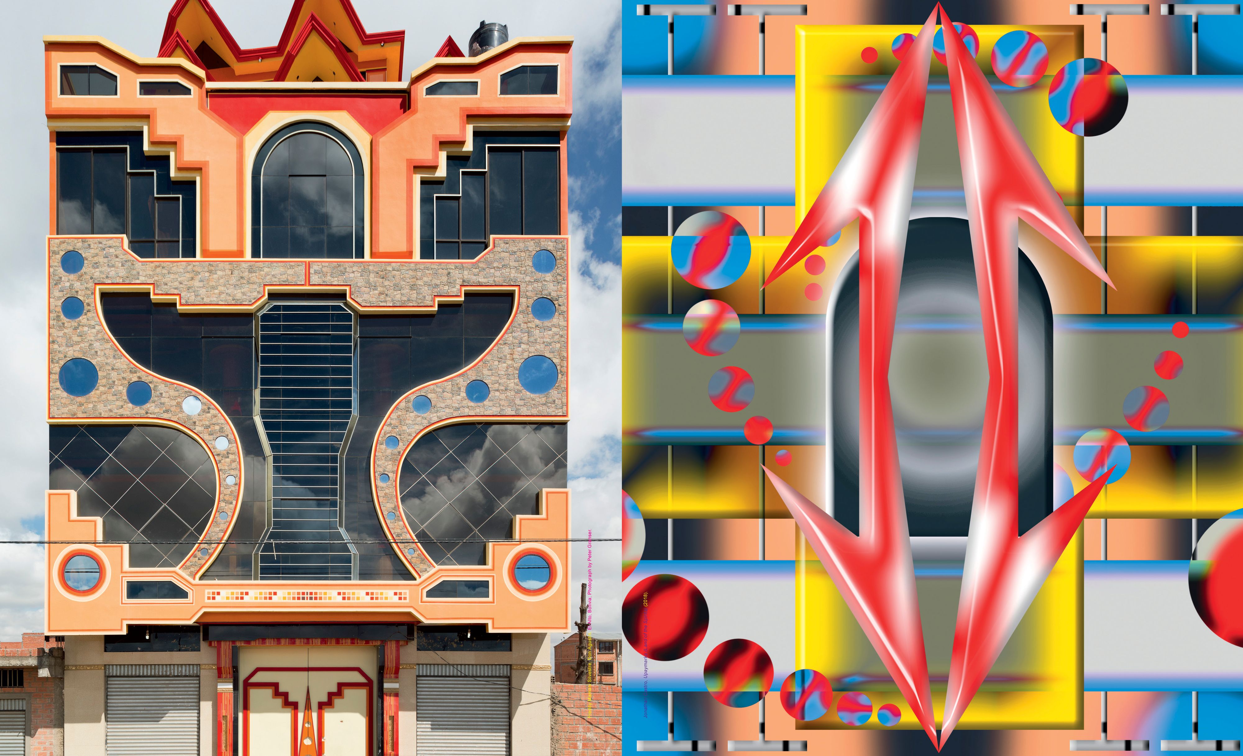 Left: Freddy Mamani Silvestre, Crucero del Sur, El Alto, Bolivia; Photography by Peter Granser. Right: Jonathan Castro, Ajayu (Main Soul) (2018).