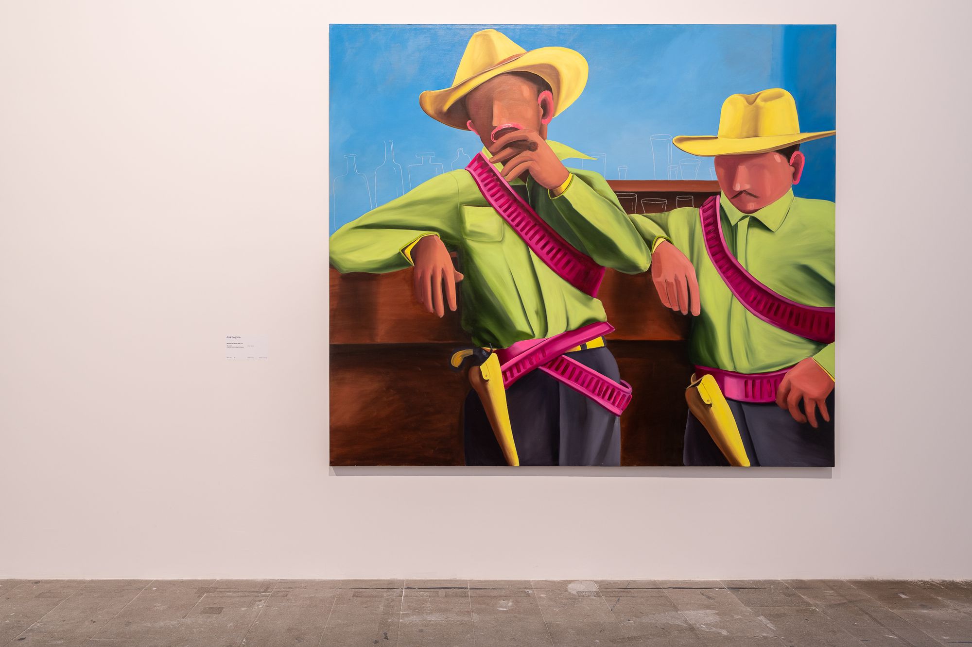 Ana Segovia loves movies. He’s a painter, but he grew up immersed in the classics of the Golden Age of Mexican Cinema (Cine de Oro), of which his great-grandfather, Fernando de Fuentes, was a leading figure. “Eighty percent of the Cine de Oro is the mythologizing of Mexican rural life, through Modernist projects that are as much for Mexicans as they are for the rest of the world,” he explains. Using tropes of masculinity, from the charro to the vaquero and all their associated accoutrements — pistols, cocks (the avian kind) — Segovia’s pictorial investigations question how moving images reflect and reproduce identity. “In my work, the composition is always rooted in cinema, even if the format varies,” he says, adding that he’s been obsessed with caballerangos (horse wranglers) since childhood. Threads of homoeroticism and humor run through his work, and he is often the punchline of his own jokes, exploring and subverting his own fascination with macho culture. His 2021 exhibition at the Museo de Arte Carrillo Gil, Well, This Song’s Over (Pos’ se acabó este cantar) focused on the intimacy of figures, but not faces, of men in pairs and groups. For the 2024 Venice Biennale, he adapted a video depicting the subtle choreography of two neon-clad charros. Lately, he has been fictionalizing film history, allowing himself to “invent characters, movies, and archives,” painting them in his signature radiant technicolor palette. “I’m developing a body of work based on a fictional character named Ramón,” Segovia says. “But the only thing you see is his ass and his package. Close-up.”