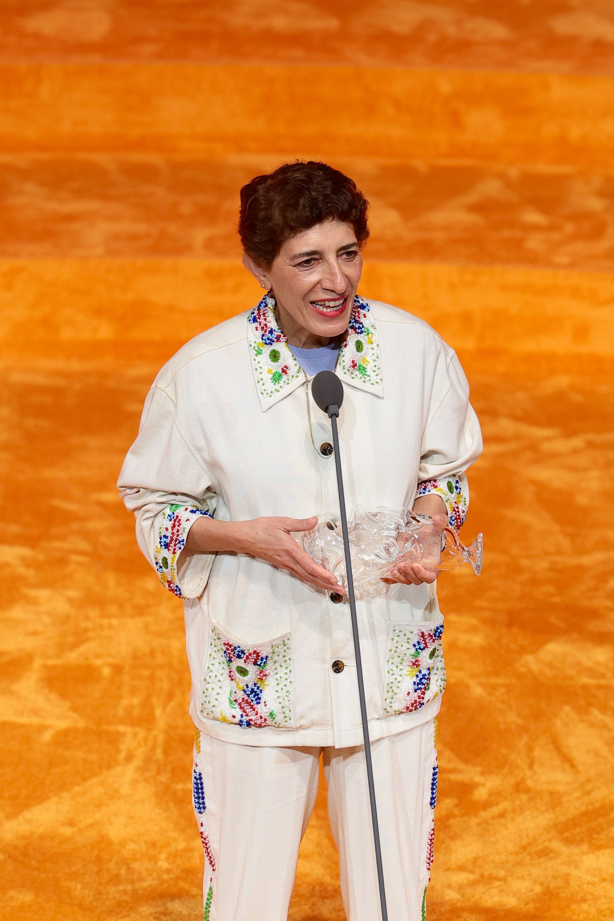 None of this seemed to faze the 12 Gold Medalists. Joel Wachs of the Warhol Foundation was honored as patron of the arts; Formafantasma took Cross-Disciplinary; Emerging went to Mohammad Alfaraj and Saodat Ismailova (whose Swiss Institute show opens January 2026); Nairy Baghramian and Ibrahim Mahama were named Established; Candice Hopkins won for Curatorship; and Negar Azimi for Media & Storytelling, among others. The BOSS Award for Outstanding Achievement went to Meriem Bennani, who fastened a green, red, black, and white flag pin to her German blazer and pledged part of her award money to Bilna’es, a platform that supports artists without institutional backing, with a special focus on Palestine.