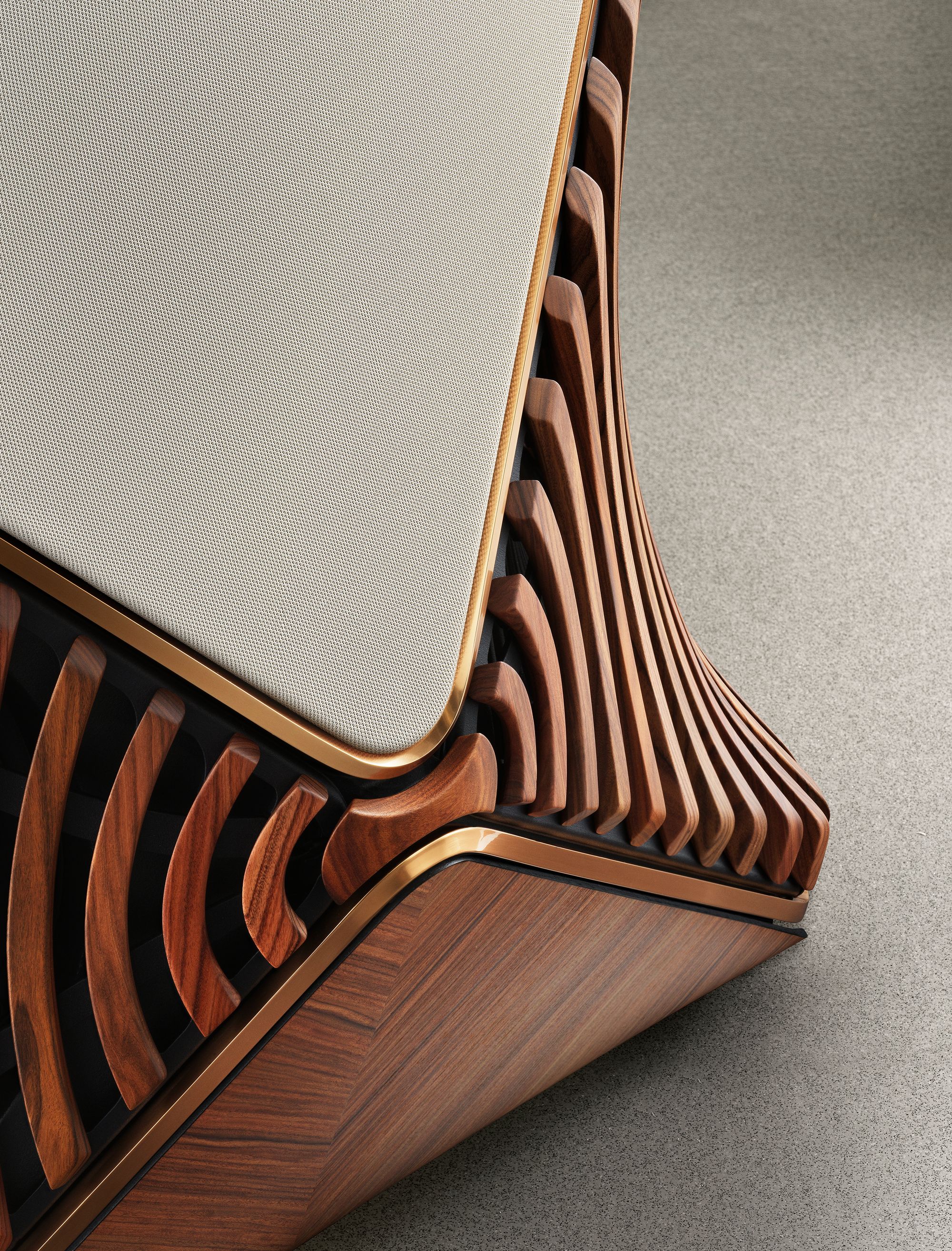 The same certainly holds true for the Beolab 90 speaker system. First introduced in 2015 and originally designed by André Poulheim of Studio Noto, the speaker has now been supercharged by B&O’s in-house design team (lead by Kresten Bjørn Krab-Bjerre) as an even more visually uncompromising object that treats sound equipment less as background appliance than as a full-blown presence. The two new editions, Monarch and Zenith, quite literally put the “bang” back into speaker design, through a level of material finish that feels closer to sculpture than hi-fi equipment.