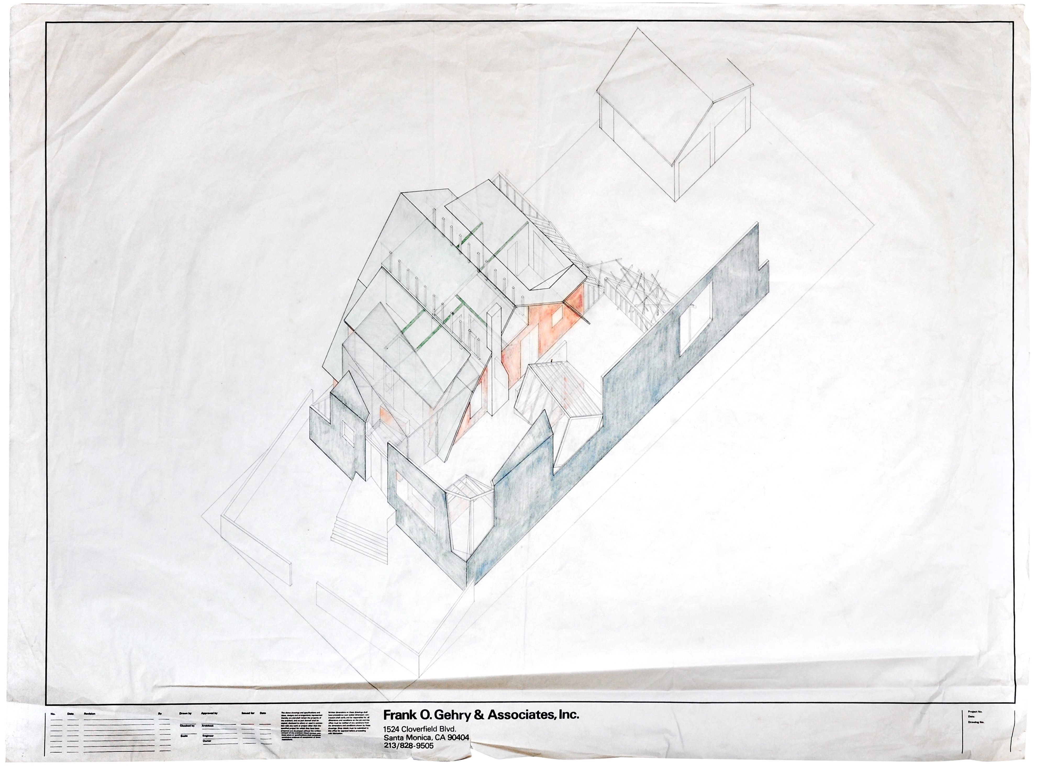 An axonometric drawing of the famous Gehry Residence in Santa Monica. In the early 1990s, the Gehrys would expand the home further to make space for the changing needs of the family. Whereas the original 1978 addition incensed neighbors, the new revisions upset Deconstructivism purists who felt the house now looked too “finished.” Gehry never considered the house part of the Deconstructivist movement, despite being included in a 1988 MoMA survey show curated by Philip Johnson. Sketch © Frank O. Gehry. Getty Research Institute, Los Angeles (2017.M.66), Frank Gehry Papers.