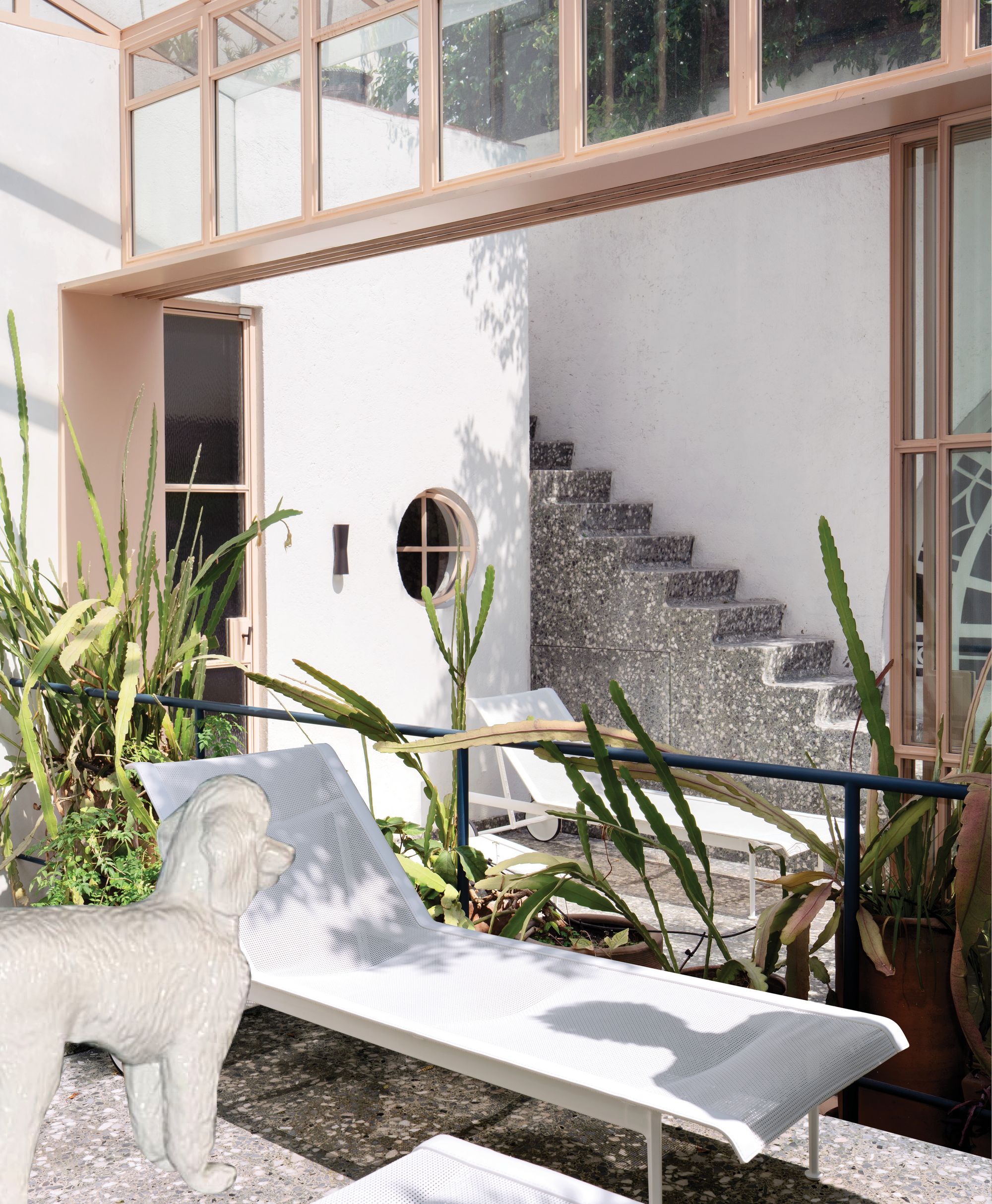 Through the atrium’s sliding glass doors lies the third-floor back terrace, which came about accidentally during Mexico City’s infamous 1985 earthquake, which destroyed the rooms that once stood there. Now an intimate sundeck for Cerrillo’s long, narrow bathroom, it features a classic 1966 sun lounger surrounded by flowerpots whose plants spill back into the atrium. Bottom left corner: a white porcelain Royal Copenhagen poodle from Cerrillo’s collection. Richard Schultz, 1966 Adjustable Chaise (1966).