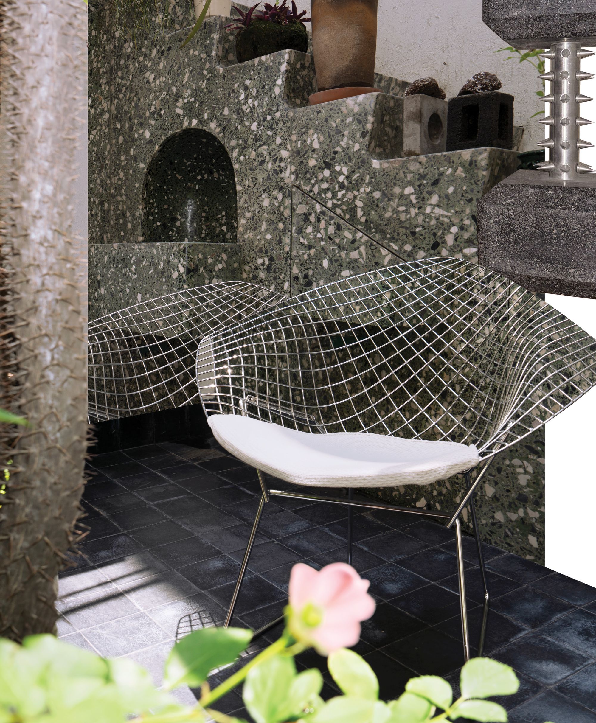 Marking the start of a sequence of terraces, the kitchen opens onto a small patio — formerly the dining room — centered on an oval terrazzo fountain, a nod to Luis Barragán’s early houses. The renovation infused the home with layered Mexican craft: green-flecked terrazzo from a fourth-generation workshop, steelwork from Chalco, and glass mosaics from a historic Cuernavaca factory once favored by Mario Pani, Diego Rivera, and other influential Mexican architects and artists. At the center of it all: Harry Bertoia’s iconic Diamond Chair. In the upper left corner: a cactus-spiked dumbbell by designer Victor Barragán, dedicated to Cerrillo’s cats. Harry Bertoia, Diamond Chair (1952).