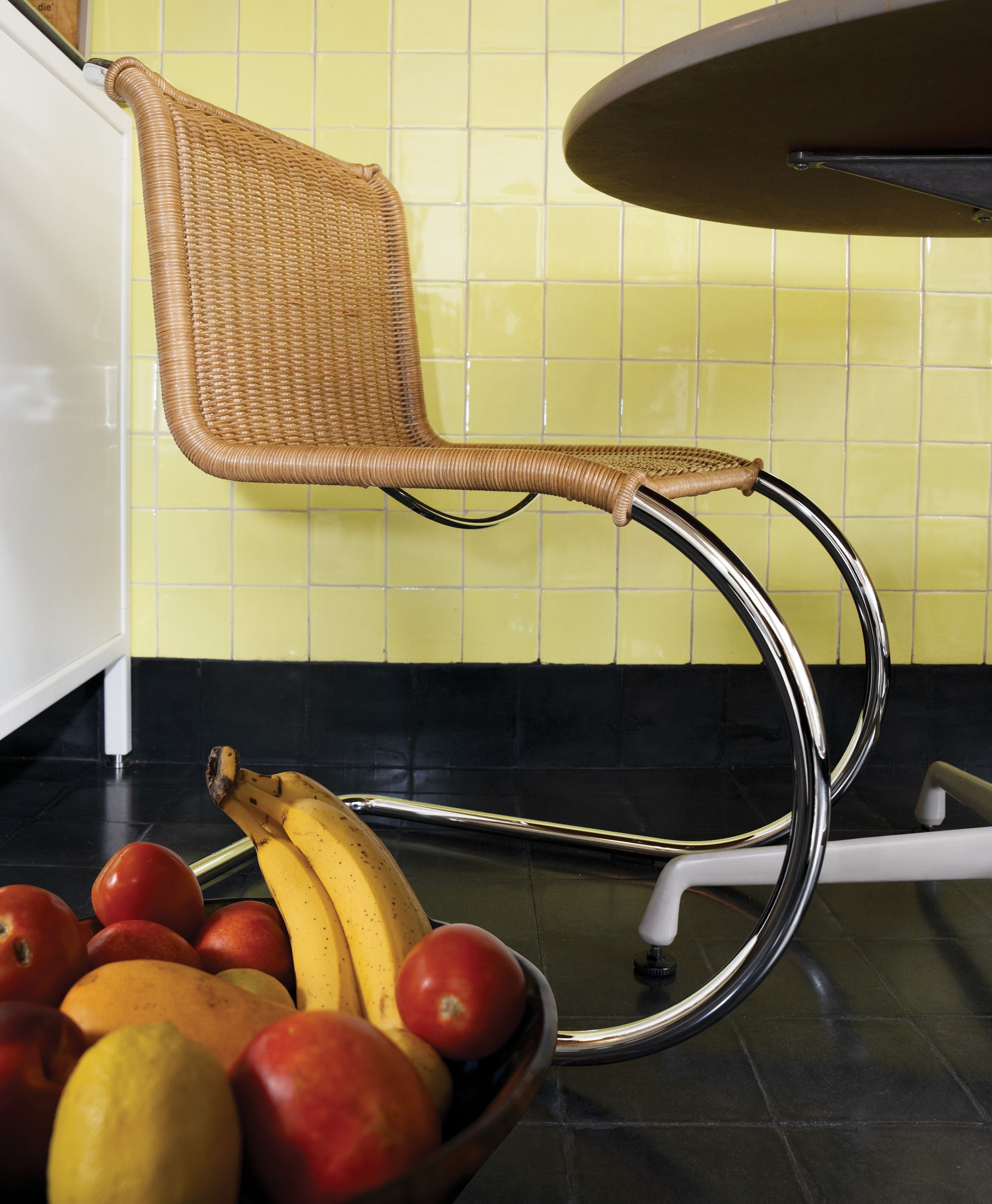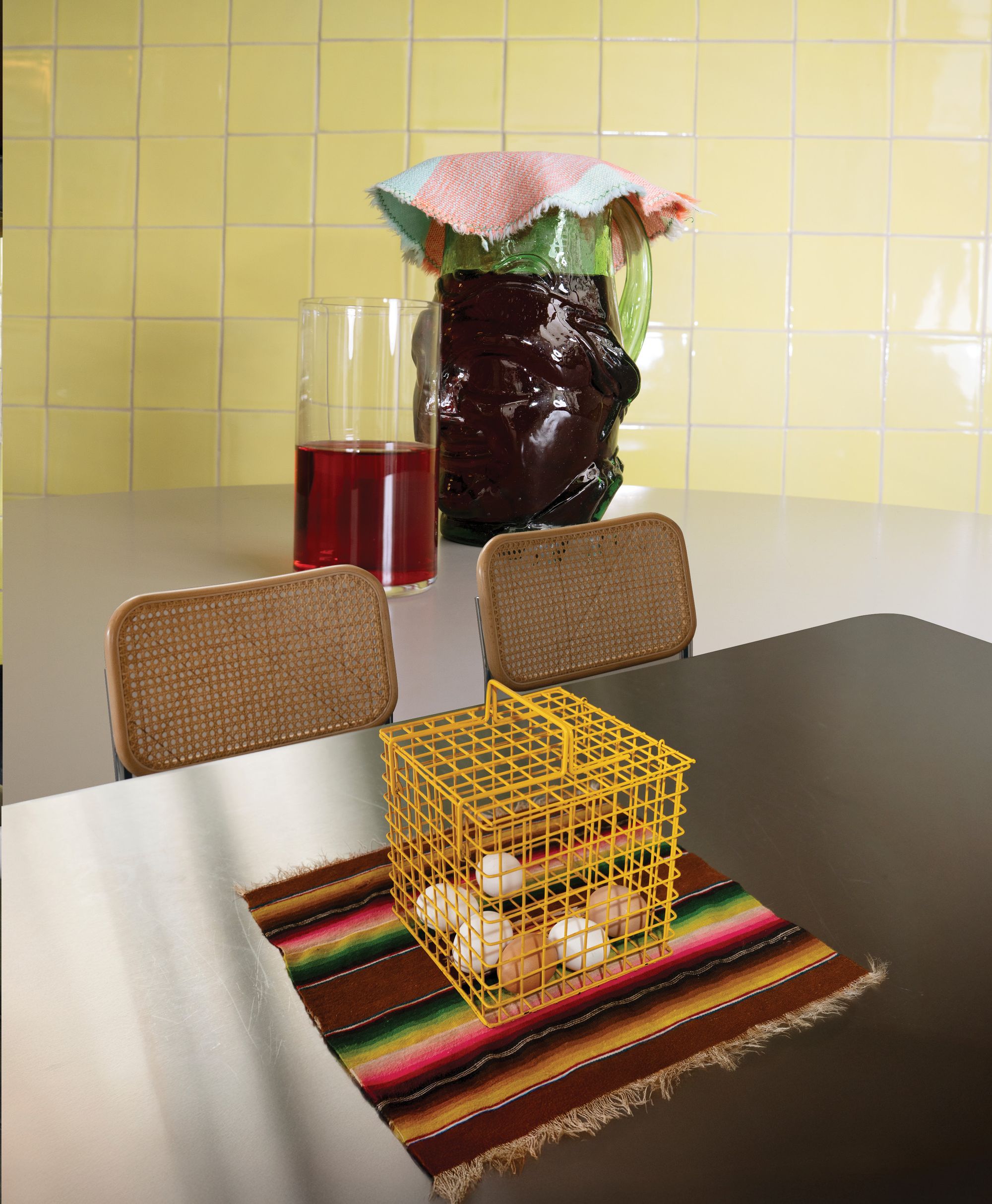 For the kitchen, Cerrillo drew inspiration from Lina Bo Bardi’s Casa de Vidro in São Paulo, adapting its generous layout to his own home. Custom yellow Talavera tiles from Dolores Hidalgo warm the atrium-facing space and recall the glow of his previous kitchen. In the breakfast nook, a classic Eames table pairs with a placed MR Chair in rattan by Ludwig Mies van der Rohe, while Marcel Breuer’s Cesca barstools line the counter. As elsewhere in the house, every object carries a story: a square egg basket from his mother’s home rests on a rare Saltillo wool sarape, and a green glass pitcher from Puebla, filled with hibiscus water, is draped in an heirloom tablecloth. Ludwig Mies van der Rohe, MR Chair Rattan