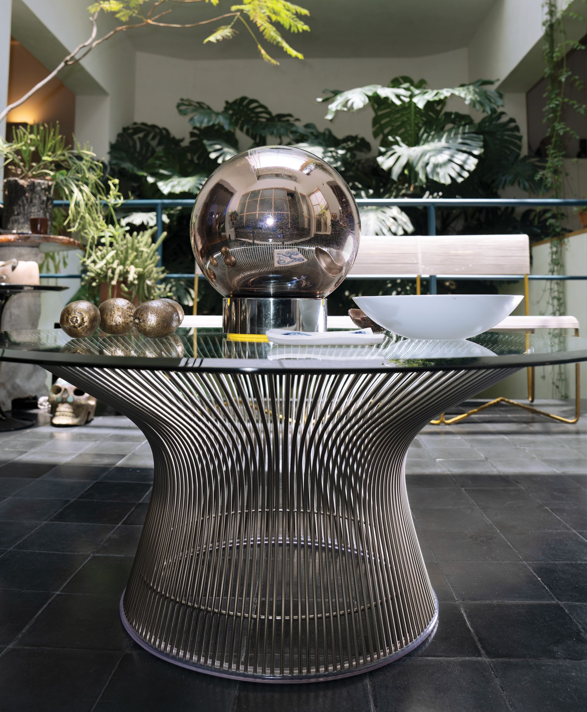 At the heart of the house, the central courtyard was reimagined as a glass-domed atrium, framing a lounge that links the dining room and kitchen while overlooking a fern garden and obsidian mosaic planter with cascading monsteras. Dragonflies buzz beneath the skylight, preserving the sensation of being outdoors. Furnishings include a Dieter Rams 620 sofa, a rare Clara Porset string bench, a green Neo-Mayan chest by Mike Díaz, and a staged Platner coffee table layered with Cerrillo’s trademark curiosities: glass and silver spheres from Guadalajara — favorites of Luis Barragán — and five bronze lemons, an artist’s proof of a sculpture from his recent exhibition, Vanitas at Andréhn-Schiptjenko in Paris. Warren Platner, Platner coffee table (1966).