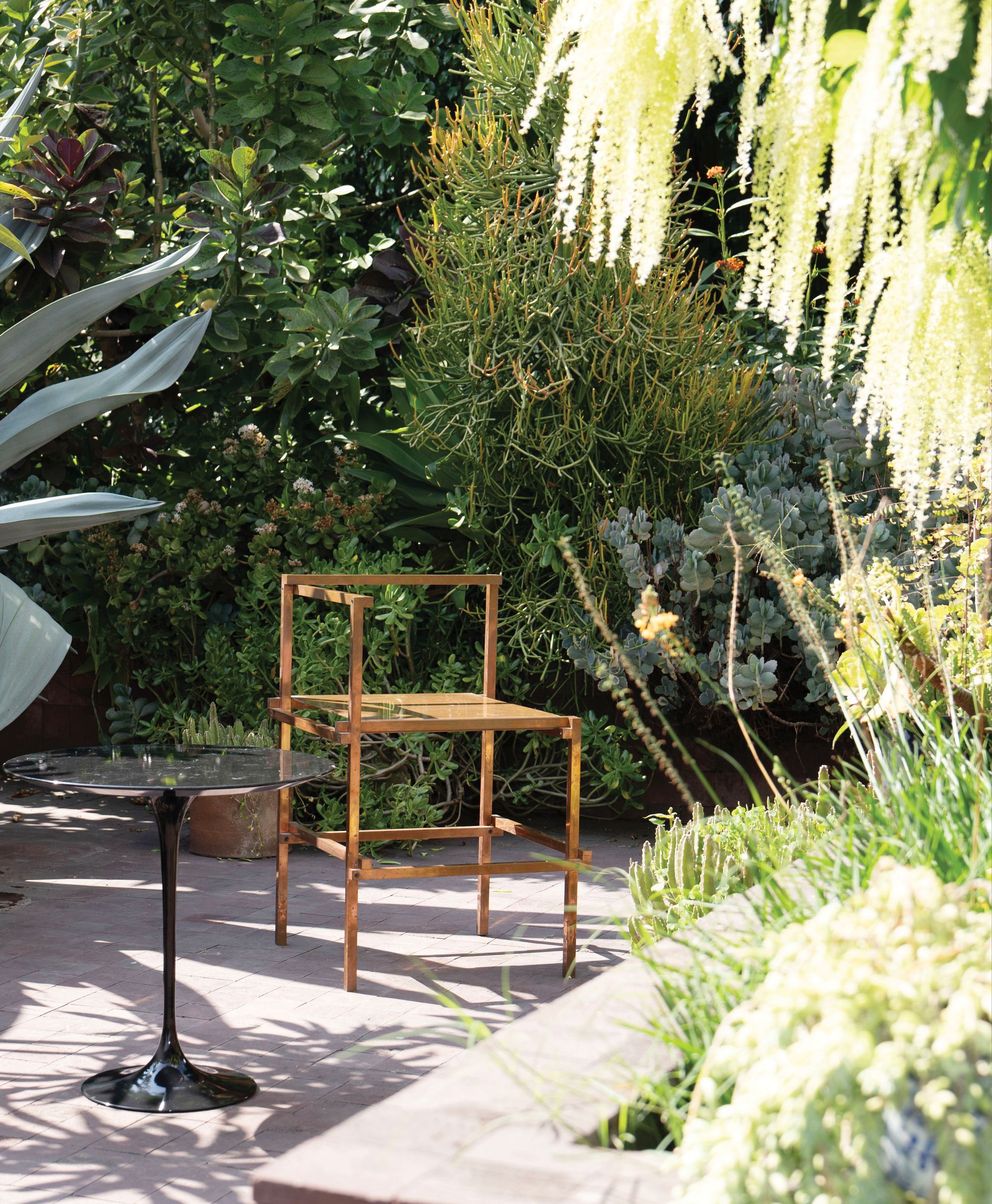 Cerrillo and Max von Werz transformed the once fenced-off rooftop into a lush city oasis, complete with a pergola, outdoor shower, and oversized planters for Cerrillo’s green thumb. To provide shade and privacy, they added a lattice steel pavilion and small tezontle-clad structures, including a powder room. Frida Escobedo’s Chair 01 (2015), a rare copper prototype from her early furniture experiments, is a focal point of the terrace. Next to it stands Eero Saarinen’s side table with a black granite top. Eero Saarinen, Saarinen side table, (1958).