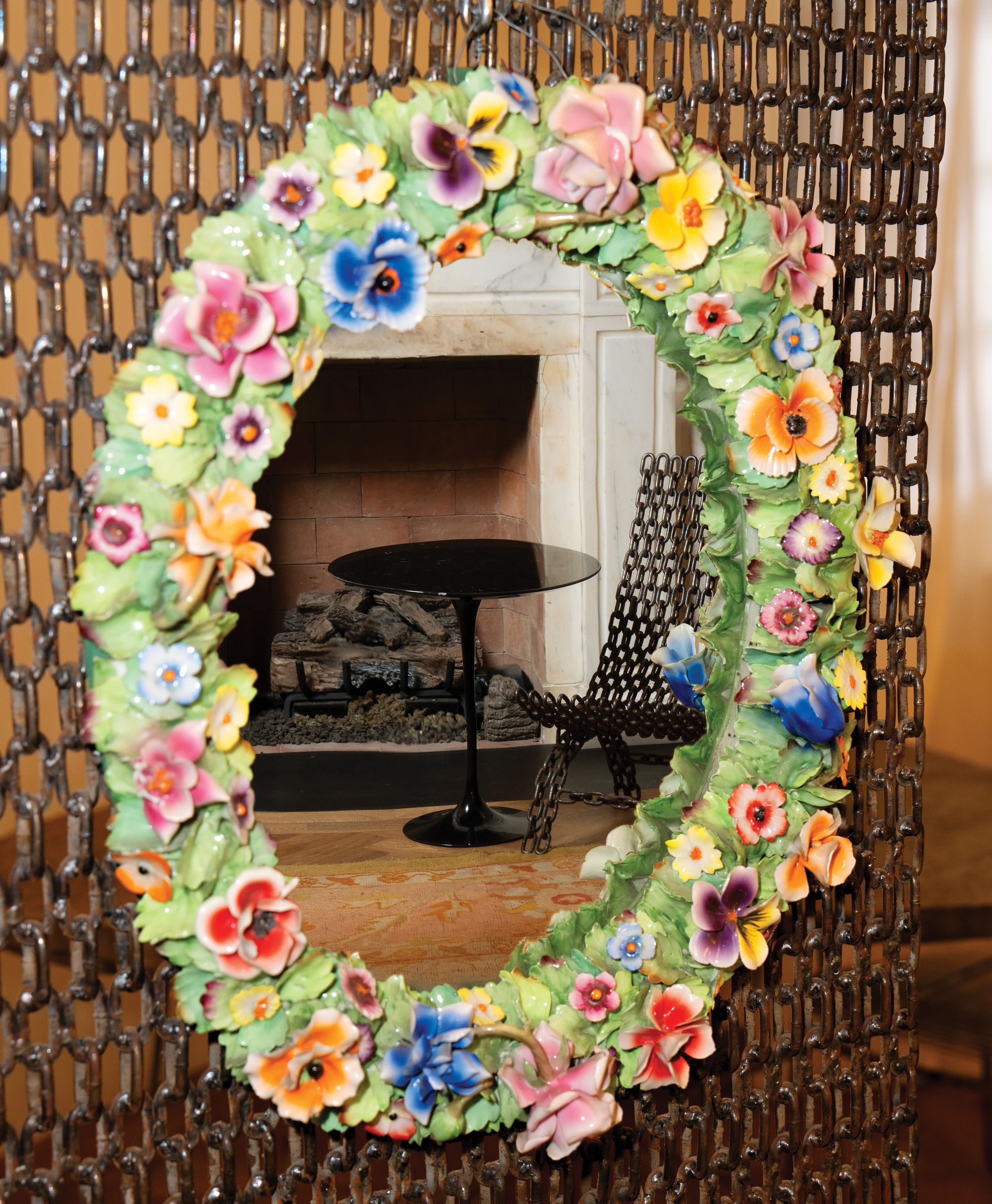 Trompe l’oeil, but not quite. In the living room, Cerrillo suspended a vintage floral-lined mirror (found in a CDMX flea market) from his chain-link Room Divider (Male Fantasies) (2021). It reflects the fireplace opposite, which sits beside Butaque (Male Fantasies) (2021), a functional artwork reimagining the iconic low, wide-seated lounge form from colonial Mexico, which merges Spanish, Indigenous, and African traditions. The piece is paired with a classic Saarinen side table in black marble. Eero Saarinen, Saarinen side table, (1958).