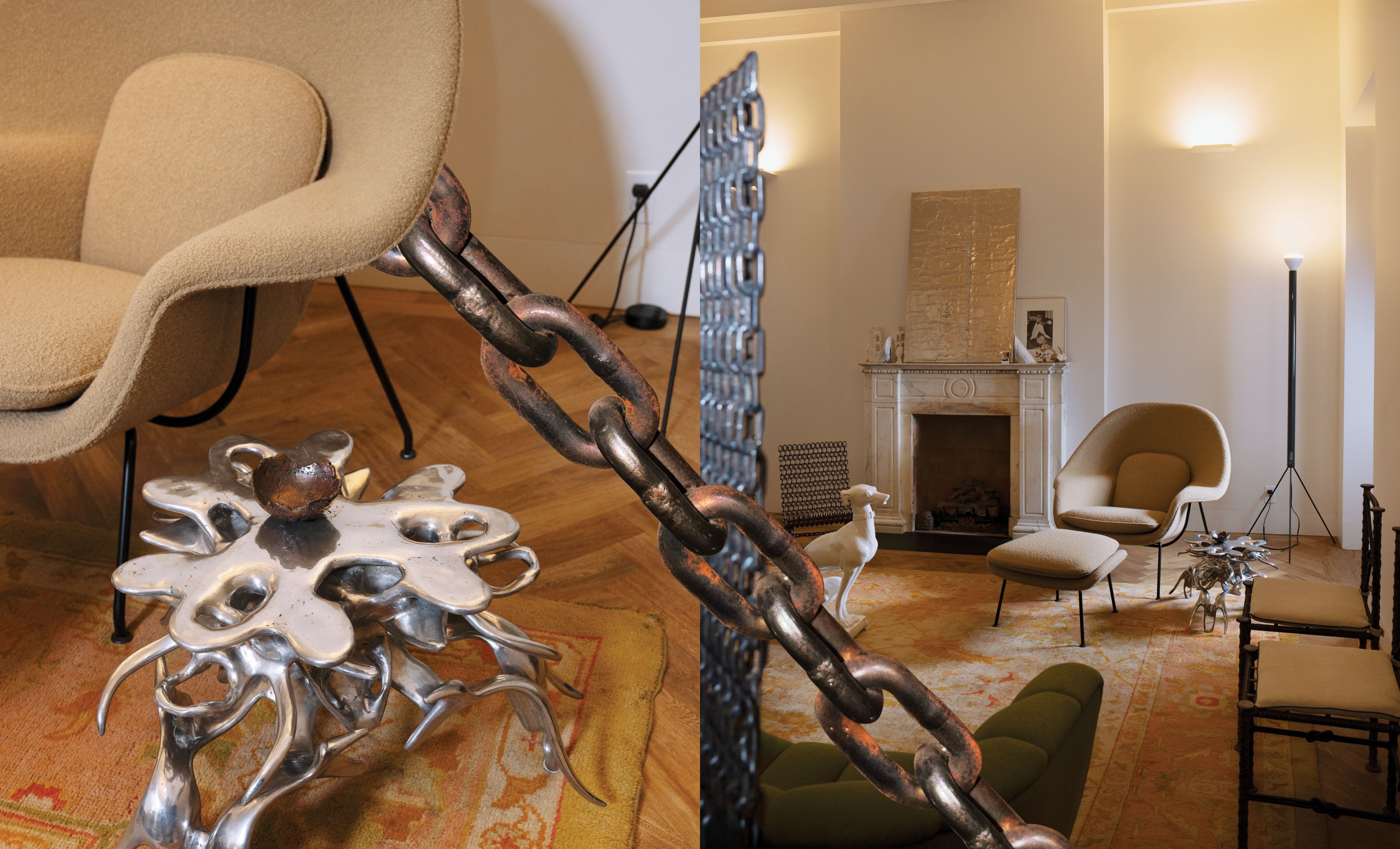 In the 380-square-foot main living room, architect Max von Werz preserved the home’s grand proportions with three tall windows, white-painted beams, and a working fireplace. Moss-green French sofas, vintage Clara Porset chairs, and a placed Womb Chair by Eero Saarinen are joined by the MD side table from ERM Studio, Eduardo Rivas’s Mexico City studio (and Cerrillo’s partner). Part of ERM’s Materia Digital collection, the table translates natural forms — orchids, bones, and curves shaped by evolution — into aluminum via parametric modeling. The silver painting above the fireplace is by Josef Strau, while a 19th-century Turkish rug grounds the space. Nearby, an Art Deco porcelain greyhound stands guard, and the chain-link room divider is by the house’s owner, artist Cerrillo, from his 2021 Male Fantasies series. Eero Saarinen, Womb Chair (1948).