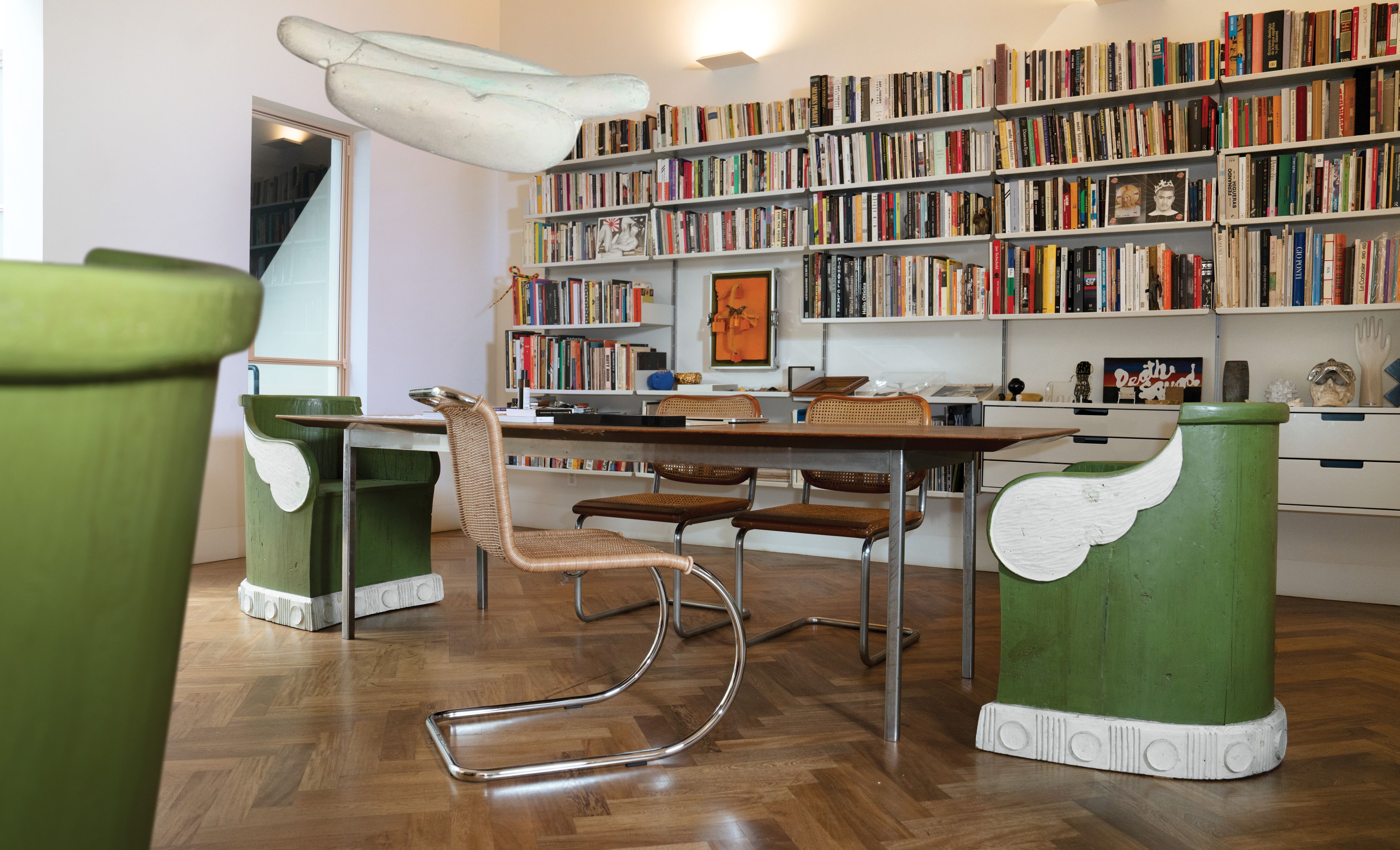 In what architect Max von Werz calls the home’s “bel étage,” the first space one enters is Cerrillo’s dining room, anchored by a 1960s Florence Knoll table he now uses mostly as a desk. It’s paired with two Marcel Breuer Cesca chairs, a staged MR Chair in rattan by Ludwig Mies van der Rohe (originally designed for the 1927 Weissenhof Estate exhibition in Stuttgart), and a pair of “slime green” wooden Jota L. chairs by his friend Mike Díaz, crafted in a Roman chariot style from reclaimed 19th–20th century antiques. Classic Dieter Rams shelves line the walls, filled with Cerrillo’s collection of books, zines, and other joterías, like a phallic ceramic hot dog by Cajsa von Zeipel. An orange relief by London-based artist Lewis Teague Wright (RIDER: Lost Lover’s Locks, 2020) adds a bright counterpoint. Elsewhere in the house, an oil painting of a muscular youth by former owner José García Ocejo holds pride of place. Ocejo also passed down one of the home’s secrets: during a visit to Mexico City, a young Jacqueline Bouvier — later Kennedy Onassis — is said to have stayed here. Ludwig Mies van der Rohe, MR Chair Rattan (1927). Marcel Breuer, Cesca chairs (1928).