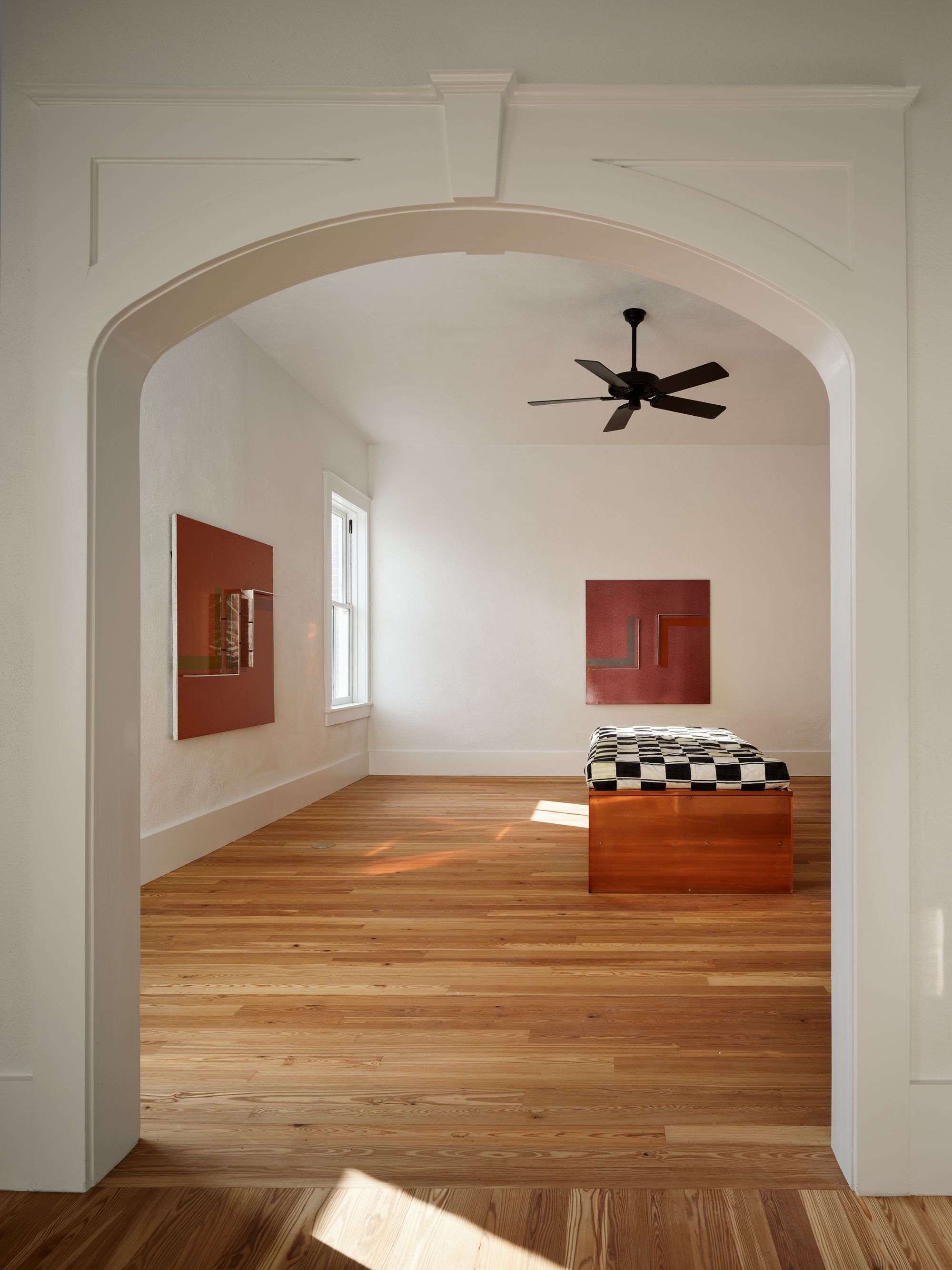 Judd’s Architecture Office provides a stark reminder of how art, furniture, and architecture should interrelate. Originally a commercial structure, the simple brick building could be anywhere, like something from an Edward Hopper painting. One sign on the west windows reads, “Clarence Judd, Architecture.” Clarence was Judd’s middle name, and the name of his grandfather, who was also a carpenter, honoring a family lineage of building things and shaping space. As with many of Judd’s properties, his architectural interventions stripped away any extraneous elements (paint, dropped ceilings, etc.) to reveal the underlying structure. In the case of 102 North Highland Avenue, this meant revealing the red brick of the exterior and interior walls, which have been meticulously repointed by Alpha Masonry. In June 2021, during the final stretch of a three-year renovation, one week before a new state-of-the-art fire system was set to be installed in the building, the Architecture Office went up in flames. Since then, it has been lovingly restored by the Judd Foundation, and opened to the public for the first time in September 2025, as the tip in the spearhead of the Marfa Restoration Project overseen by Troy and Schaum Architects.