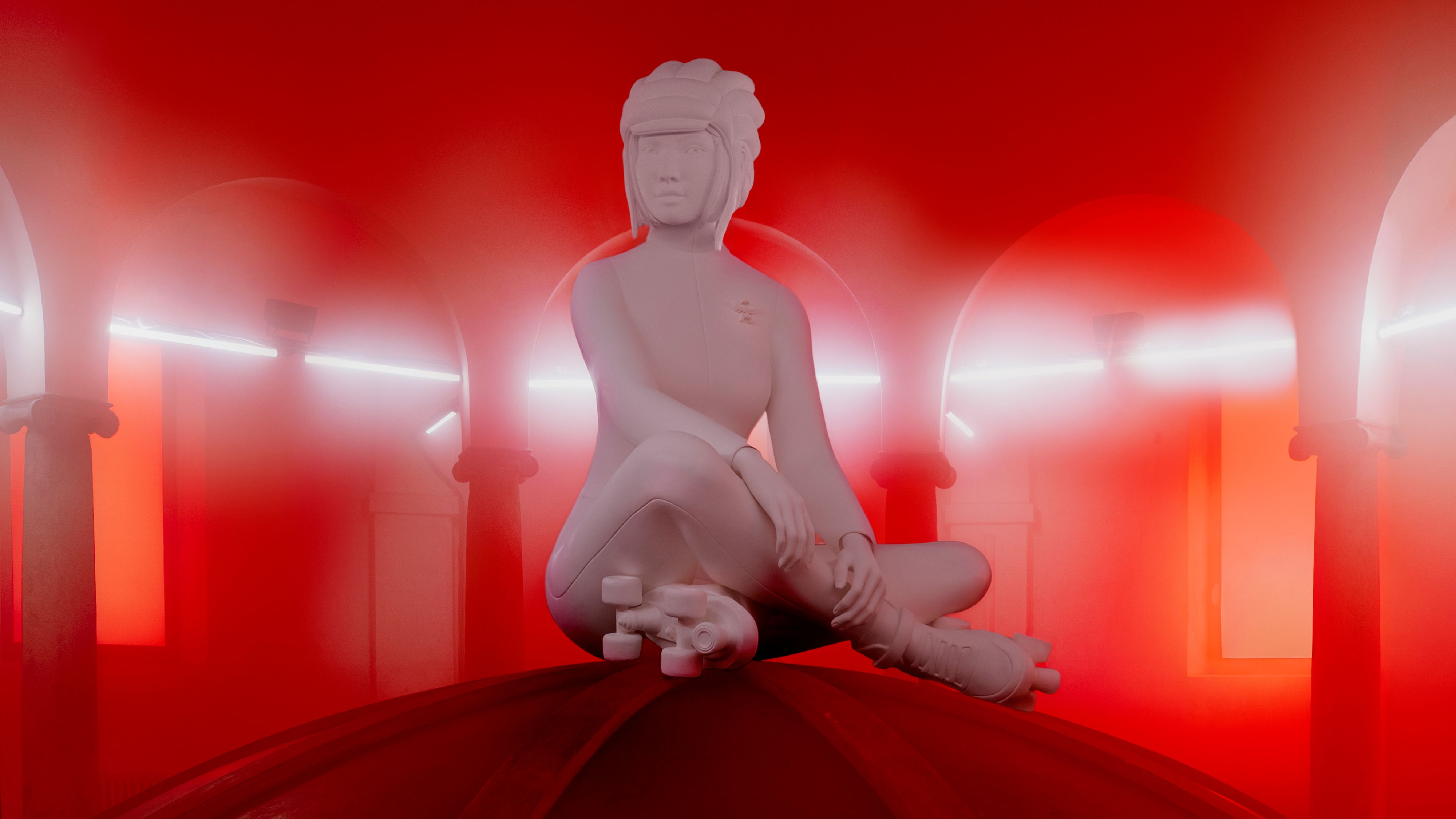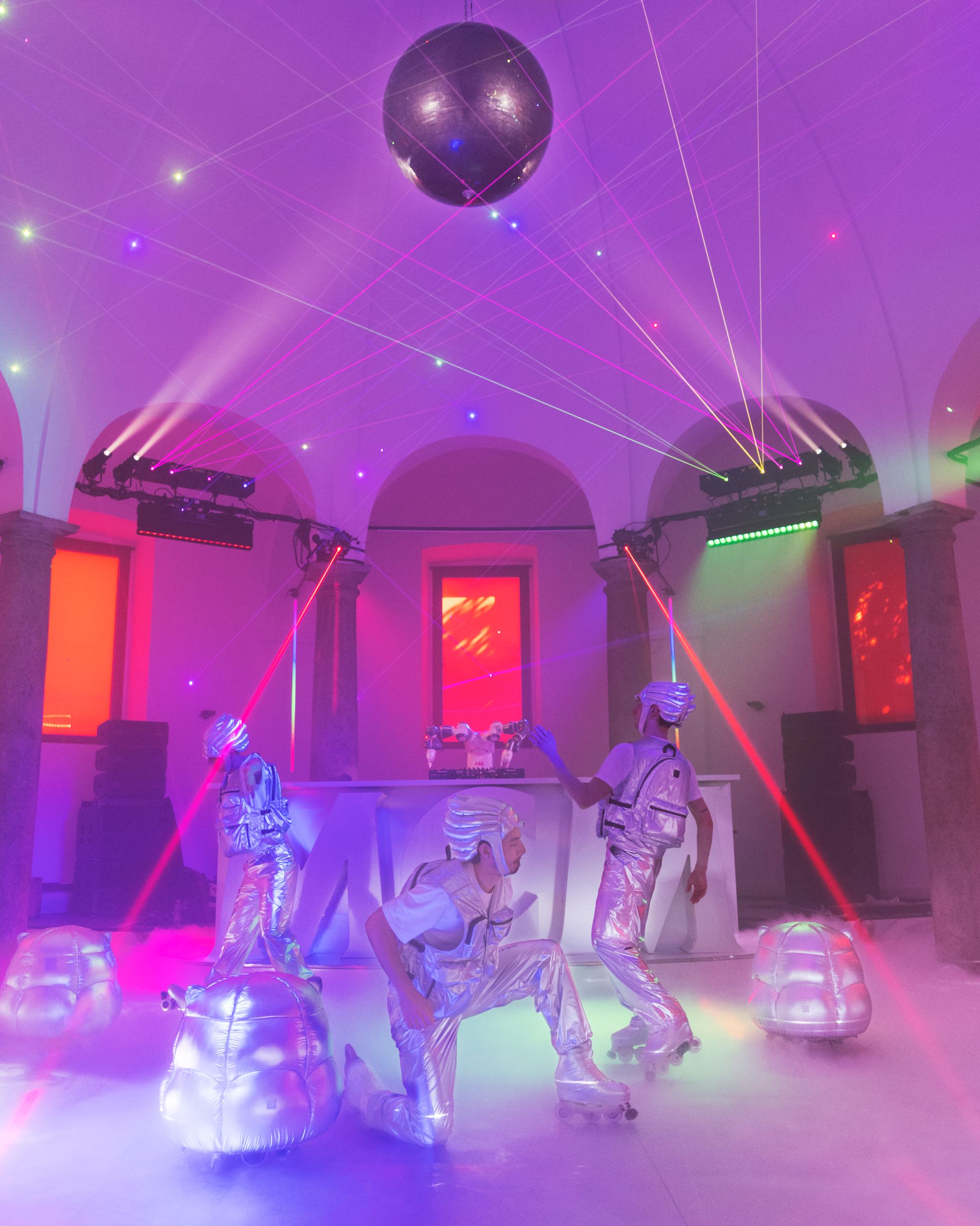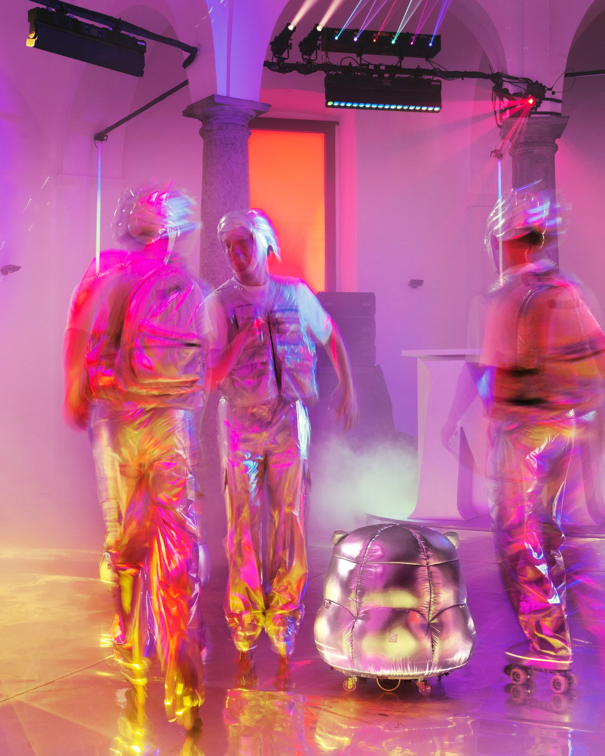 MCM was born in Munich in 1976, a city that was then the epicenter of disco — Giorgio Moroder essentially invented electronic music there, and Diana Ross and Freddie Mercury were regulars at the clubs. Fifty years later, the brand has landed on Mars, though it hasn’t forgotten its nightlife roots. For Milan Design Week 2026, MCM and Atelier Biagetti turned the 16th-century Rotonda del Pellegrini into a three-level spaceship — and it was exactly as over-the-top as that sounds: a ground floor presentation of limited-edition pieces — a weightless hand-weight, a robot-inspired pouf, and a futuristic helmet — displayed alongside archival pieces from the brand’s five-decade history; a roller rink presided over by a robot DJ spinning music curated by Berghain residents Sound Metaphors; and a "diva dome" where soprano Laura Baldassari — who is also Biagetti’s partner and co-founder of Atelier Biagetti — performed Bellini’s Casta Diva beneath a monumental avatar of a woman from the future, sculpted from recycled materials.