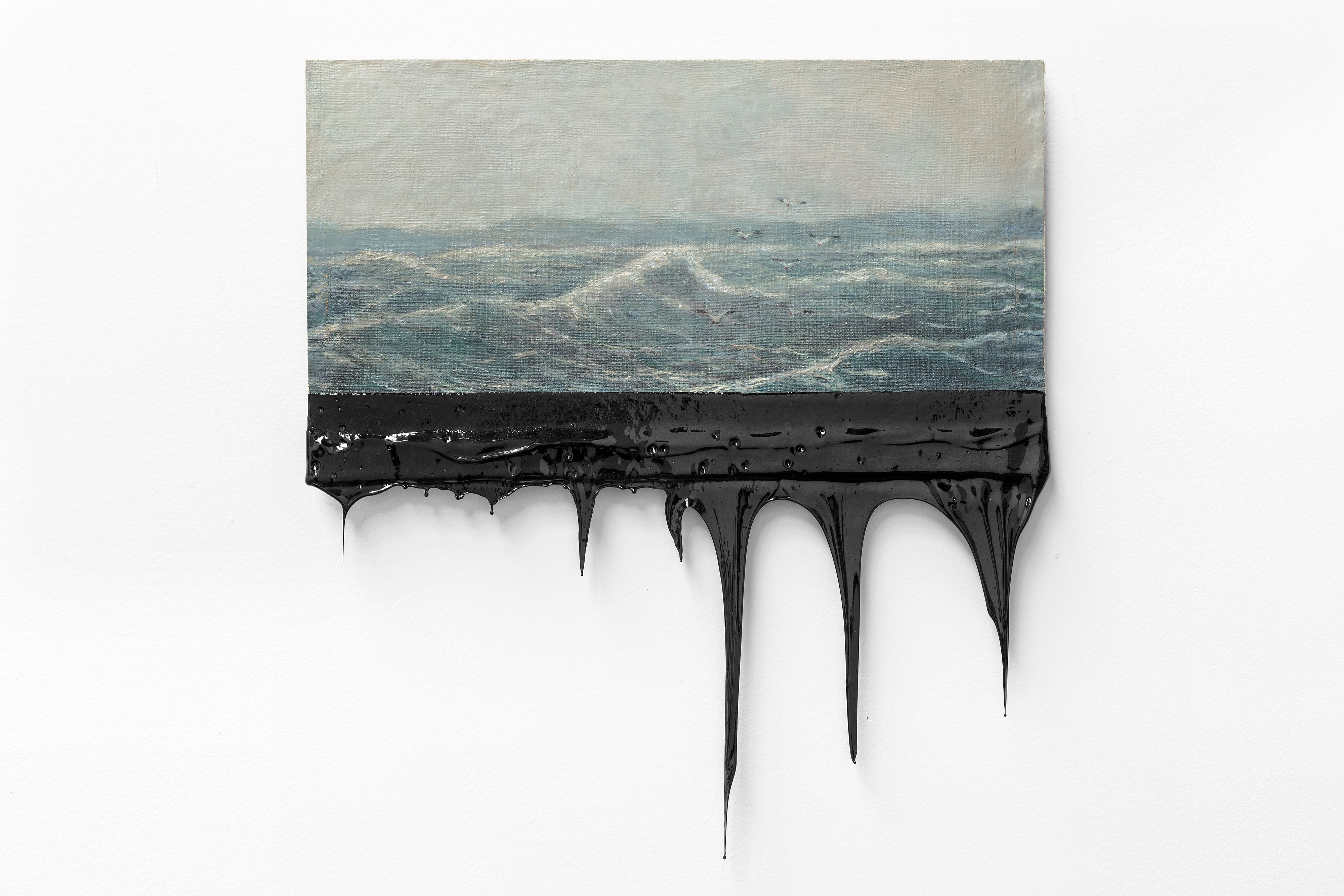 Minerva Cuevas, Overseas, 2015; oil on compressed wood board dipped in chapopote. 23.23 x 19.29 x .98 inches. Courtesy of the artist and kurimanzutto.