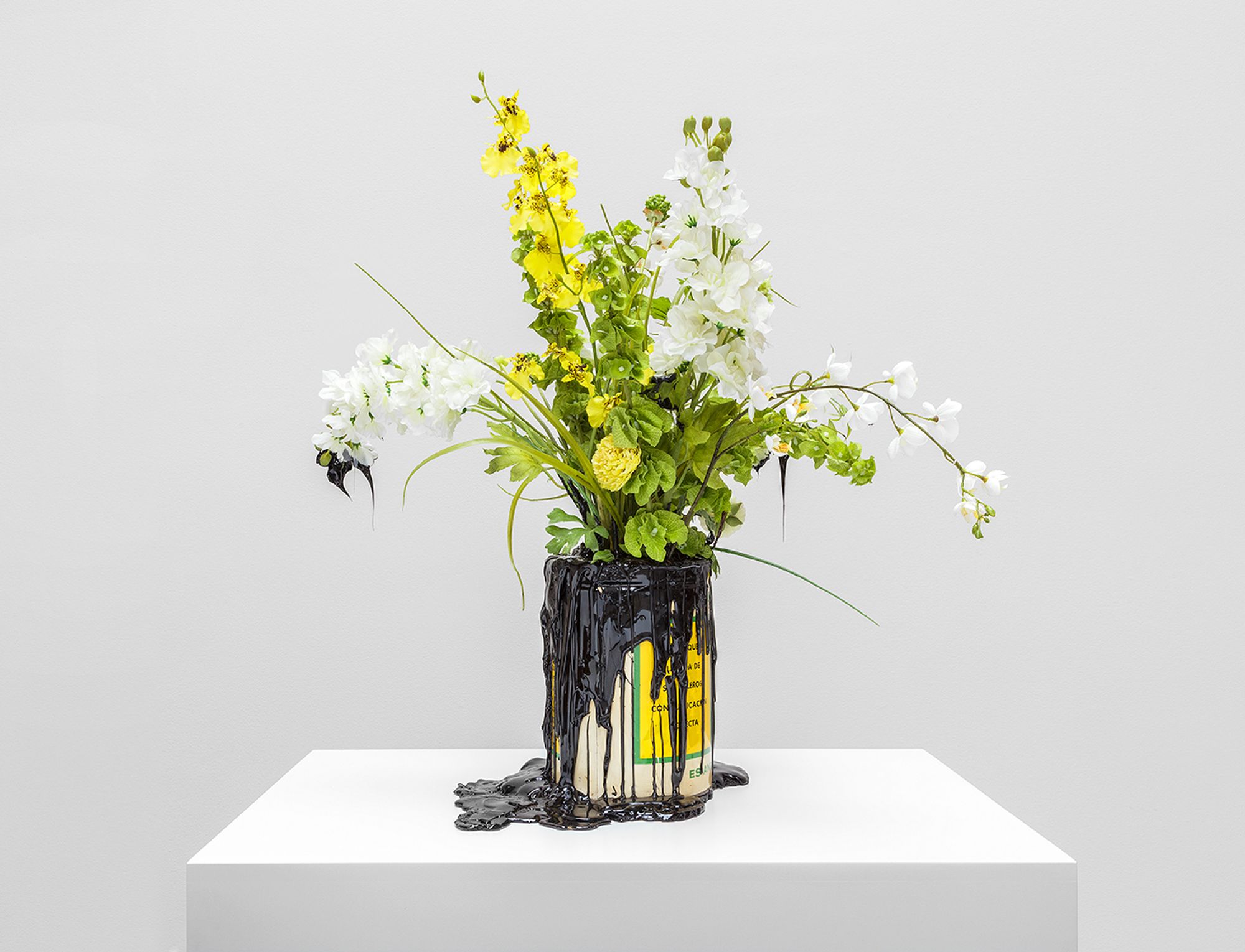 Minerva Cuevas, Vase, 2013; fabric, flowers, sand, and aluminum can covered with chapopote. 31.89 x 24.02 x 18.5 inches. Courtesy of the artist and kurimanzutto.