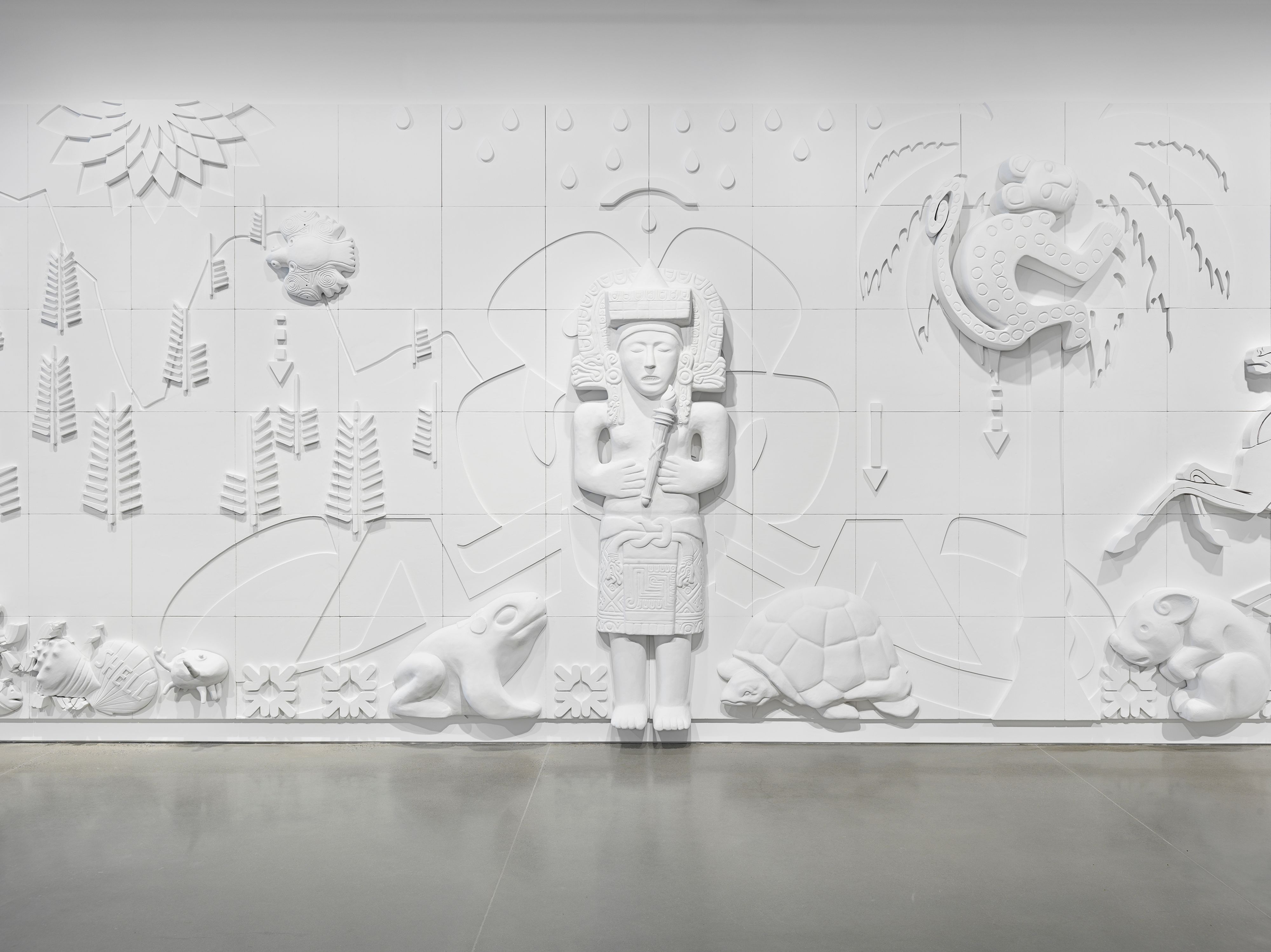 Minerva Cuevas has never been tied to a single medium, but lately she has been making murals. They tend toward high-relief figures and symbols, realized in gallery-wall white. Her 2023 exhibition, In Gods We Trust, at kurimanzutto’s New York location, featured a wall of deities from preconquest Mexican cultures and iconography from the petrochemical industry. For the 2025 Aichi Triennale in Japan, she worked on a large-scale vertical installation that draws unexpected connections between the city of Seto and the postrevolutionary artistic environment in Mexico. Cuevas isn’t bound to the wall, however — she began her career in Mexico City in the 90s, focusing on interventions in public spaces, outside the purview of institutions. In 1998, she founded Mejor Vida Corp, which carried out acts of micro-sabotage, including changing labels in supermarkets to reduce food prices and passing out free metro tickets. She doesn’t separate her work in the streets from her studio practice, although she admits they may look distinct at first glance. “Museums and cultural spaces serve a special purpose, as people go expecting to see or experience something concrete. For me, pieces in a museum are just as valuable as those that happen in the street.” Cuevas continues to combine intensive archival research with boots-on-the-ground explorations, using her long-term inquiry into value and extraction in the cacao and oil industries in Campeche to create disembodied extremities carved from chocolate and readymades covered in tar. “What connects them is an interest in the social and a reflection of their environment.”