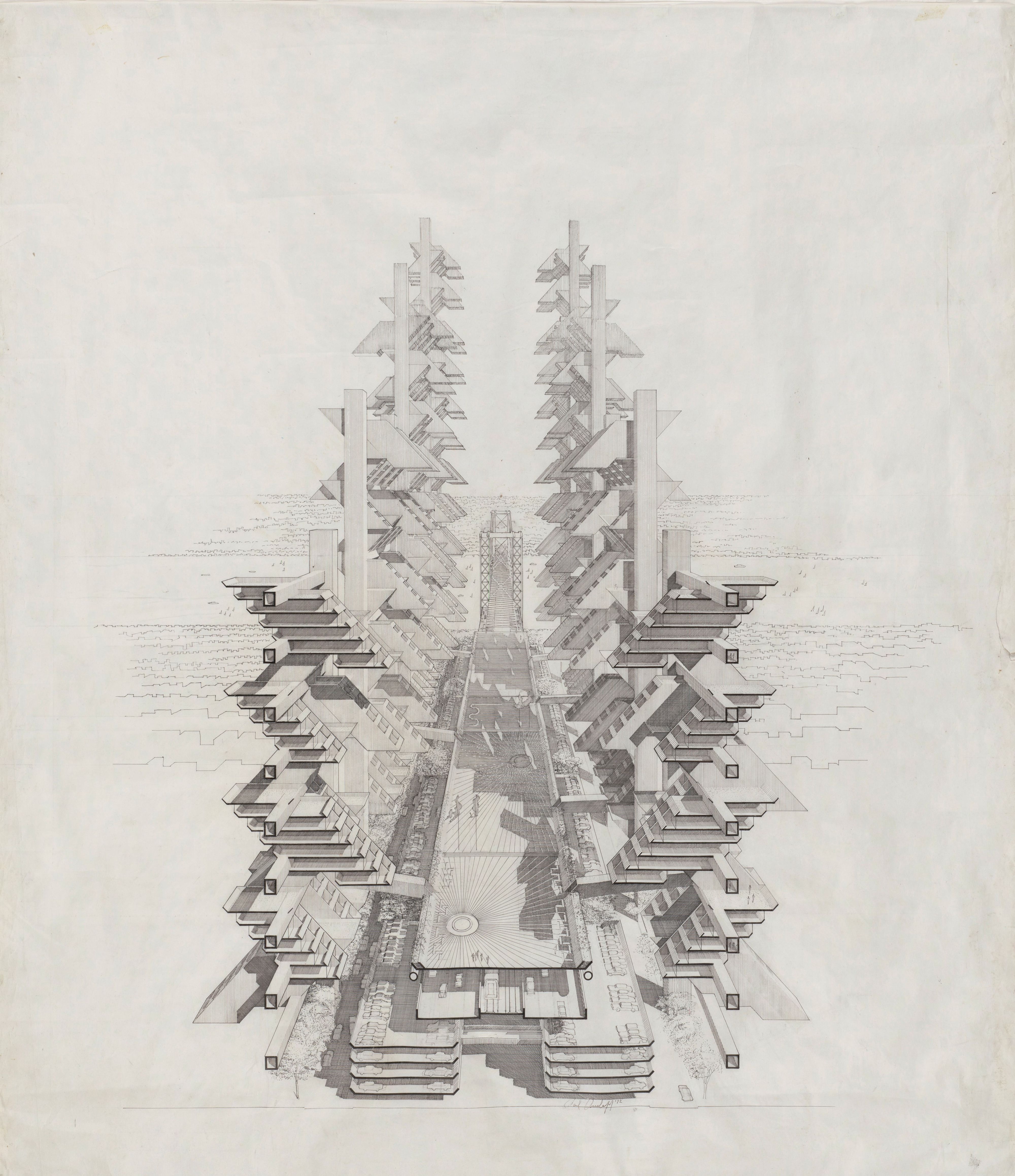 Paul Rudolph, perspective drawing of the Lower Manhattan Express / City Corridor project (unbuilt), New York, ca. 1967–72; ink on tracing paper, 21.5 x 30 inches. Prints and Photographs Division, Library of Congress.