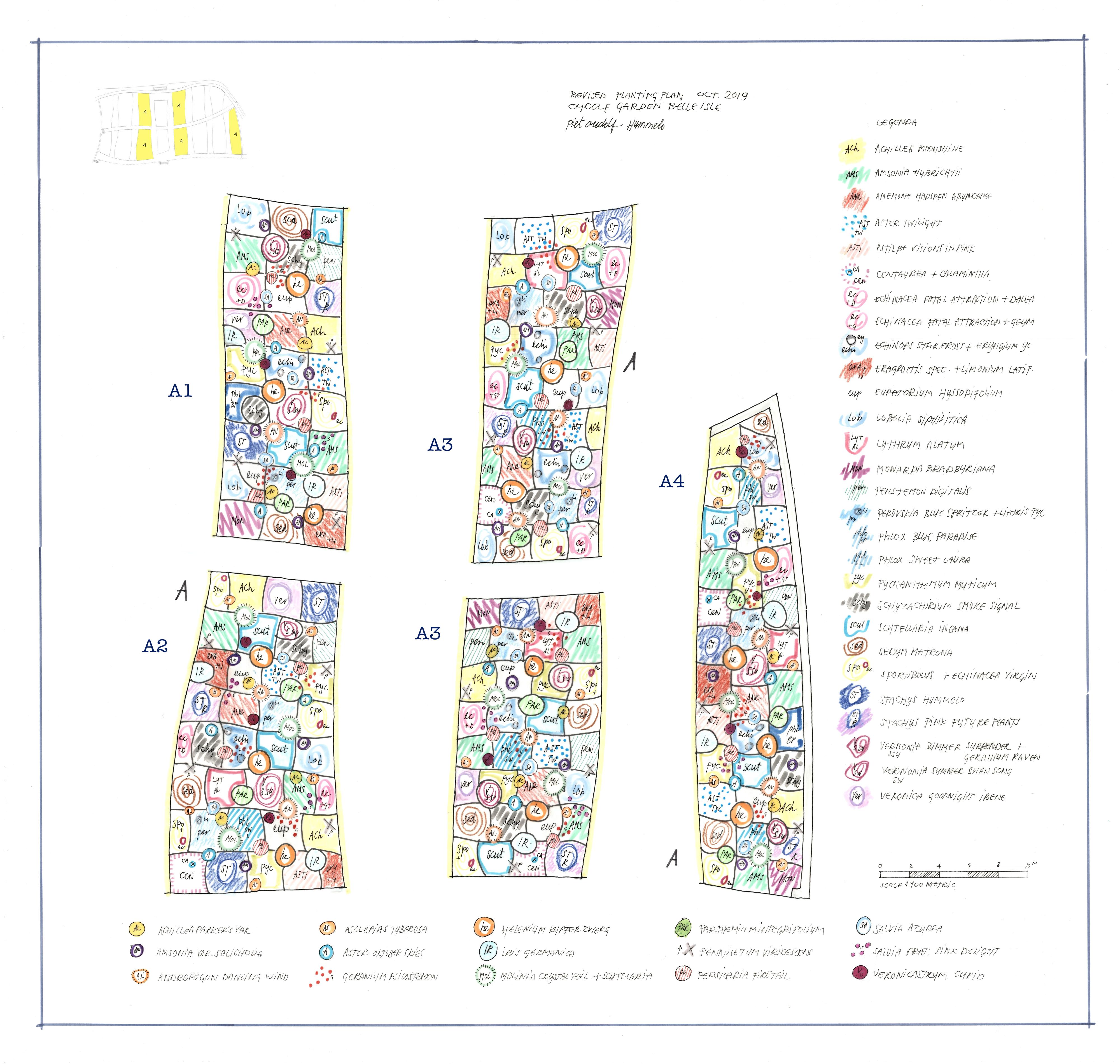 Oudolf’s revised planting plan for Belle Isle (2021), a three-acre garden in Detroit that features more than 160 varieties of perennials, grasses, shrubs, and trees. For his gardens to appear wild, meticulous planning is required, which he works out in colorful drawings that map the sequence of plants — the colors mark structure, height, and timing rather than the hues of the blooms themselves.