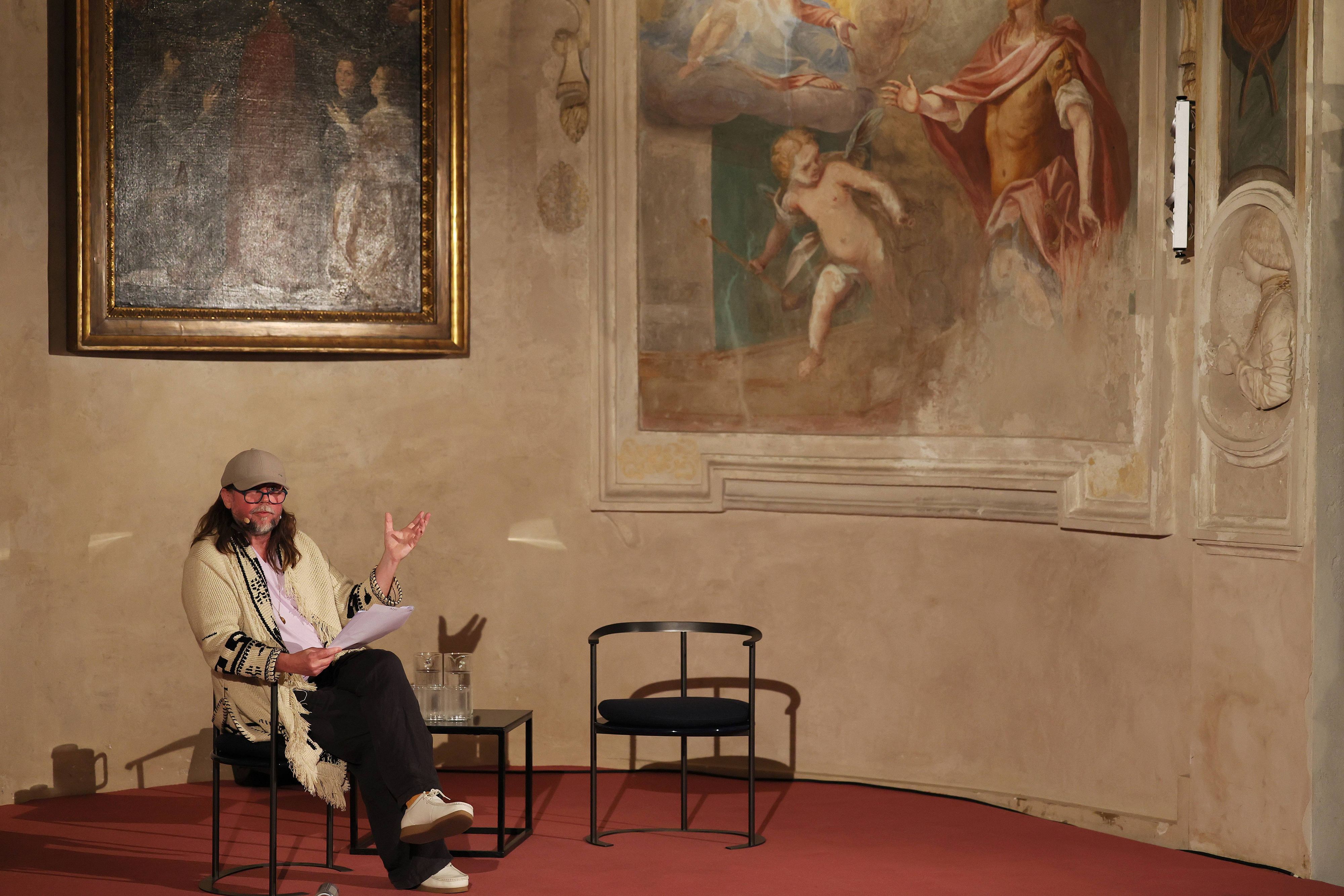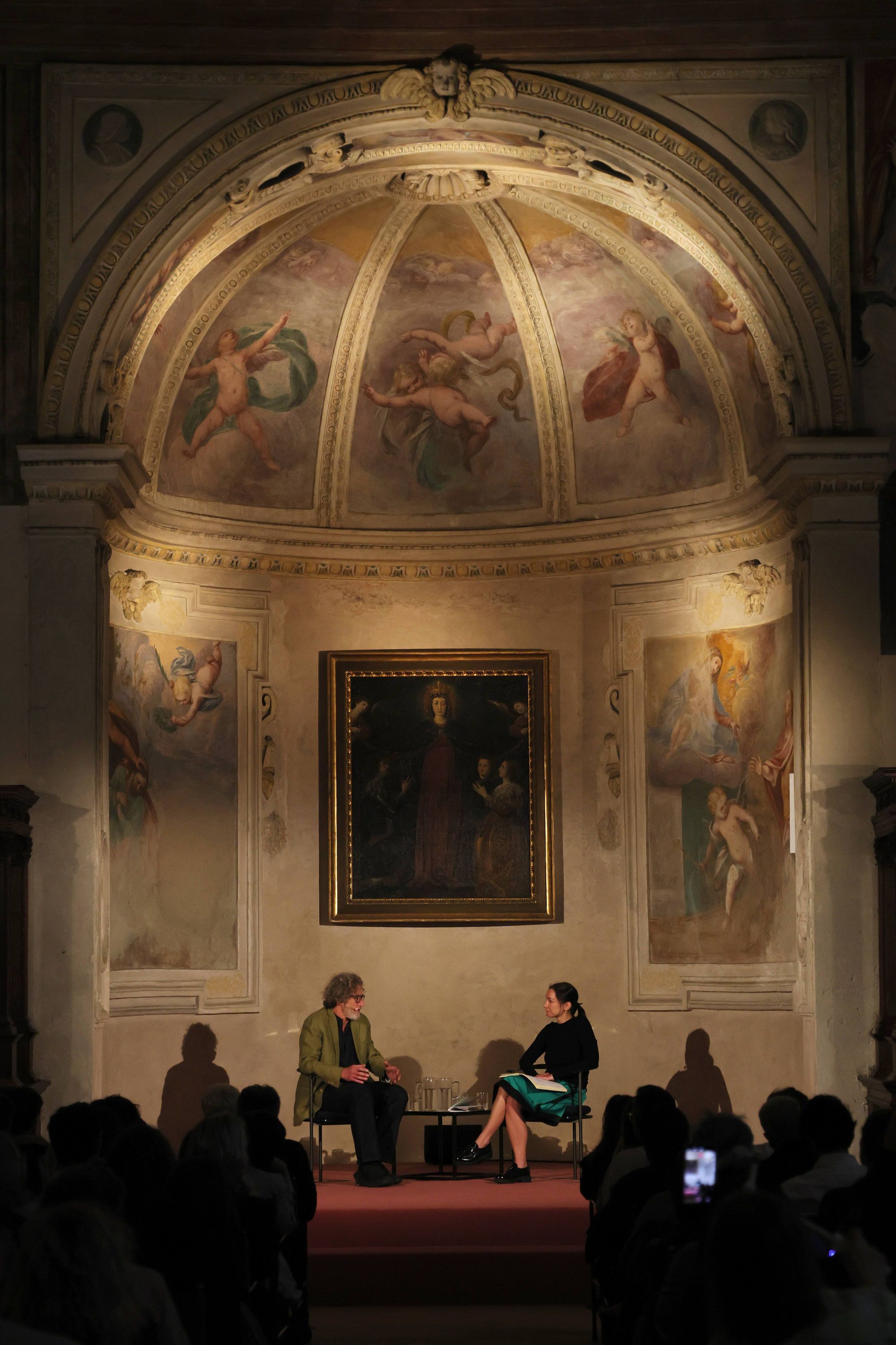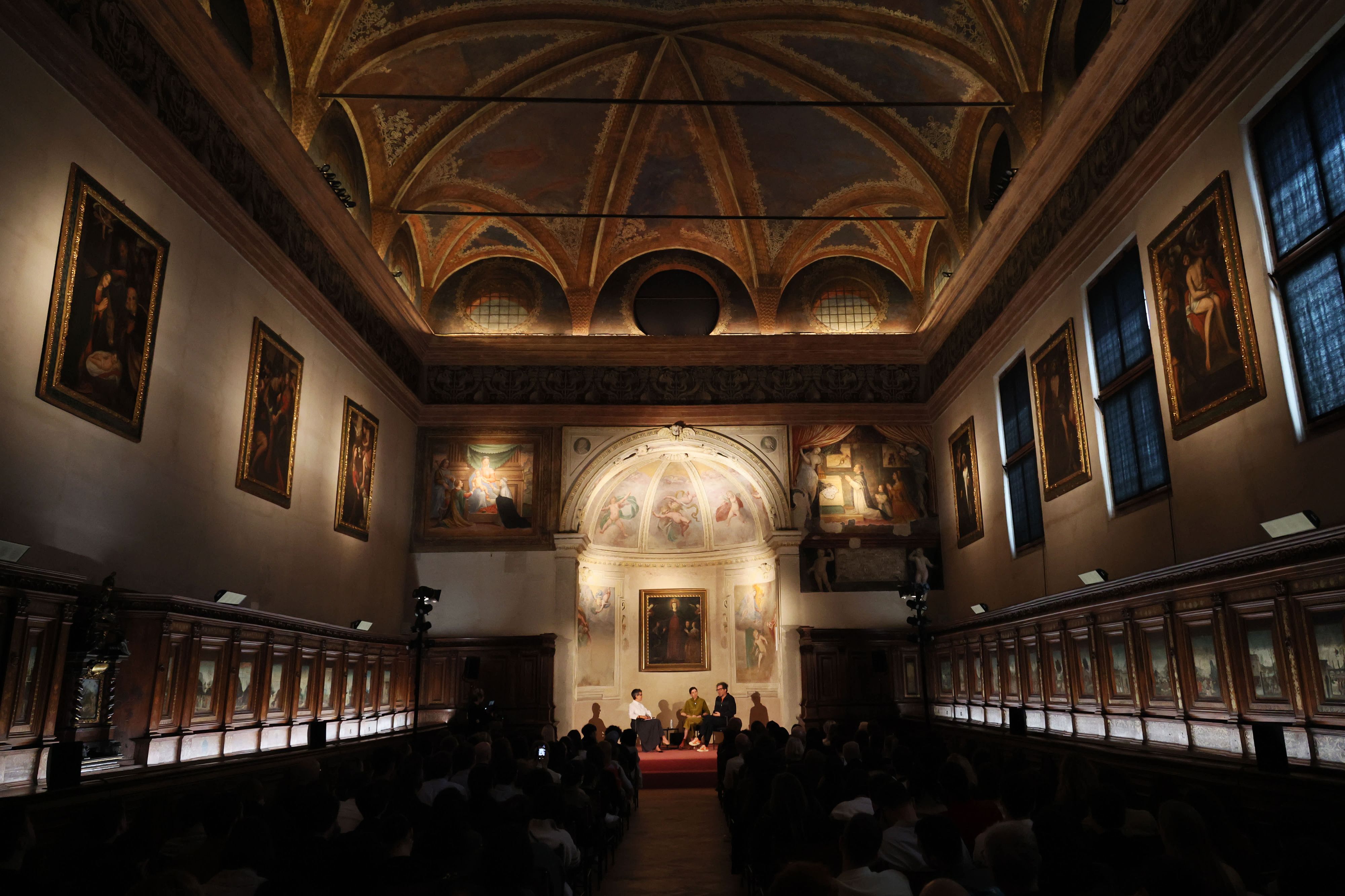 Given this year’s focus — the power of the image — it’s only fitting that the lectures, conversations, and performances (this year was the first time music was integrated into the programming) took place mainly inside the Sacrestia, a Renaissance space attributed to Bramante that sits within the same complex as The Last Supper itself, its walls lined with inlaid cabinets of early sixteenth-century biblical scenes by Domenico and Francesco Morone and its ceiling painted an otherworldly shade of purple and scattered with gold stars.