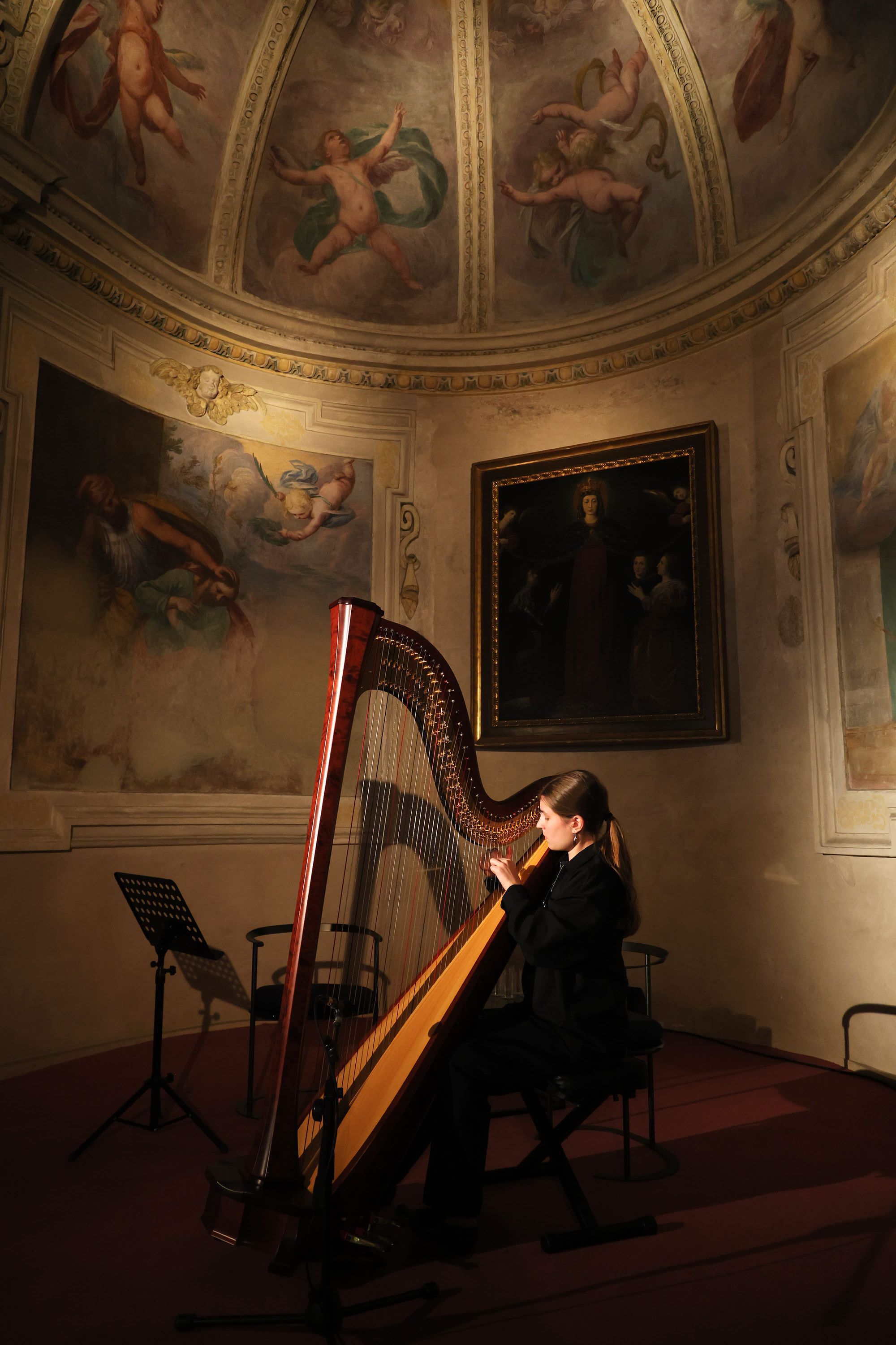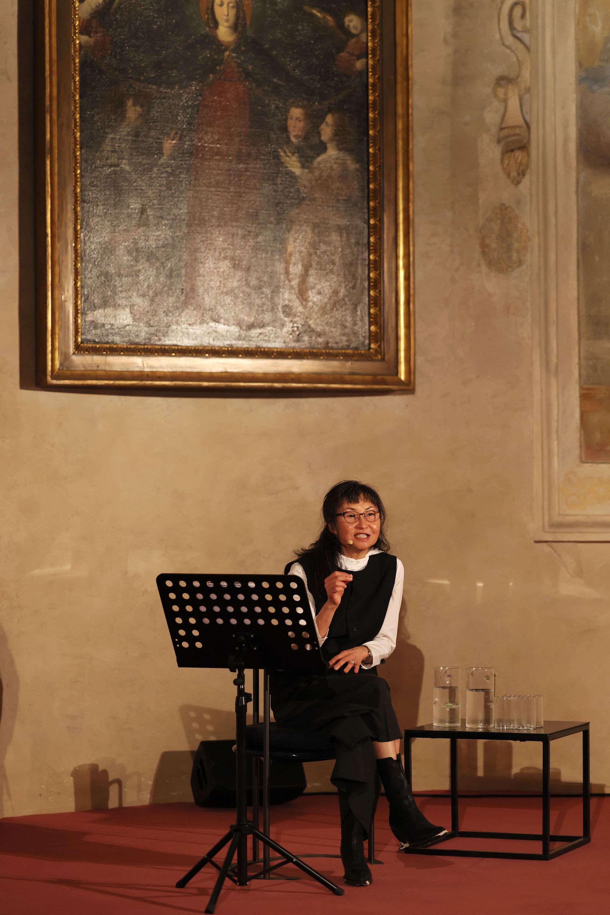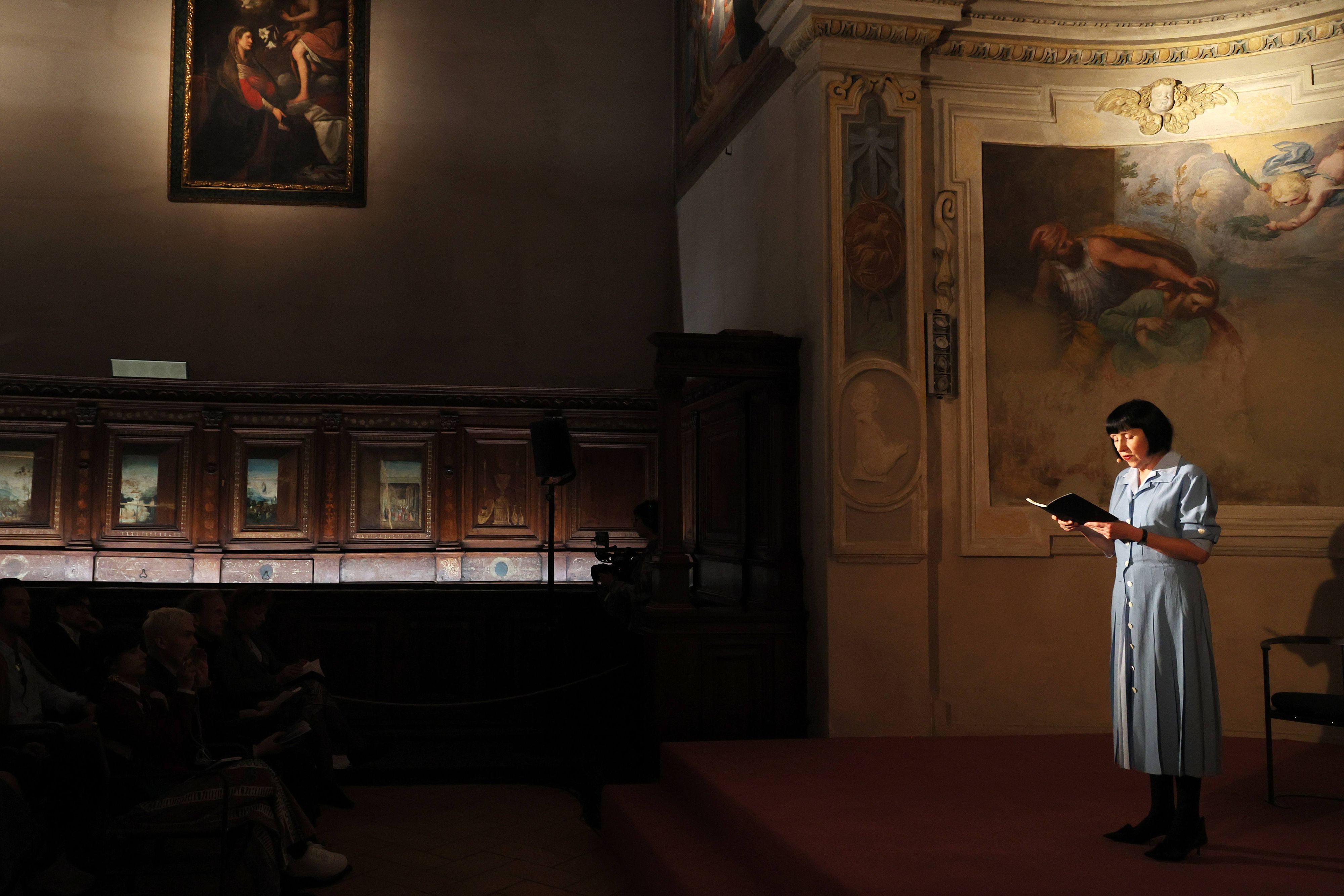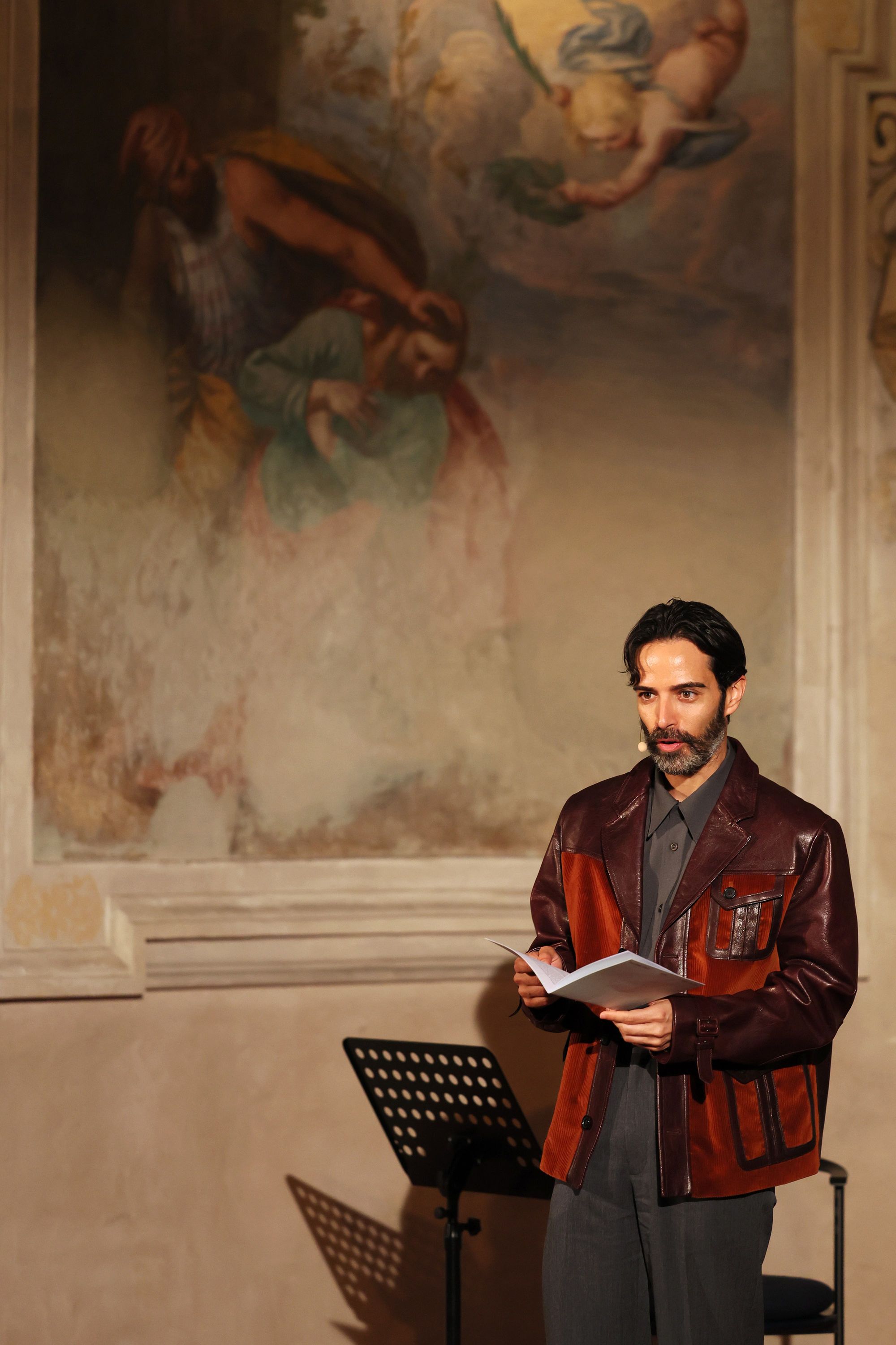 Given this year’s focus — the power of the image — it’s only fitting that the lectures, conversations, and performances (this year was the first time music was integrated into the programming) took place mainly inside the Sacrestia, a Renaissance space attributed to Bramante that sits within the same complex as The Last Supper itself, its walls lined with inlaid cabinets of early sixteenth-century biblical scenes by Domenico and Francesco Morone and its ceiling painted an otherworldly shade of purple and scattered with gold stars.