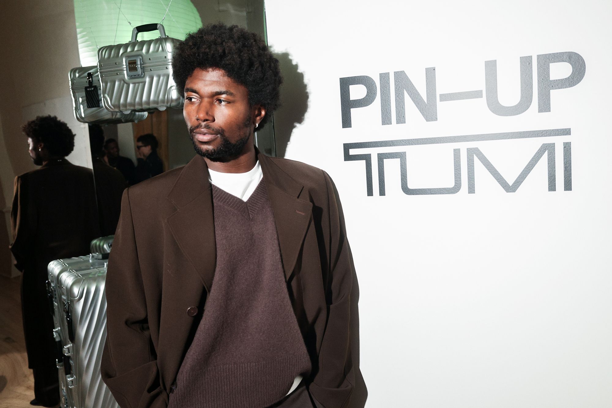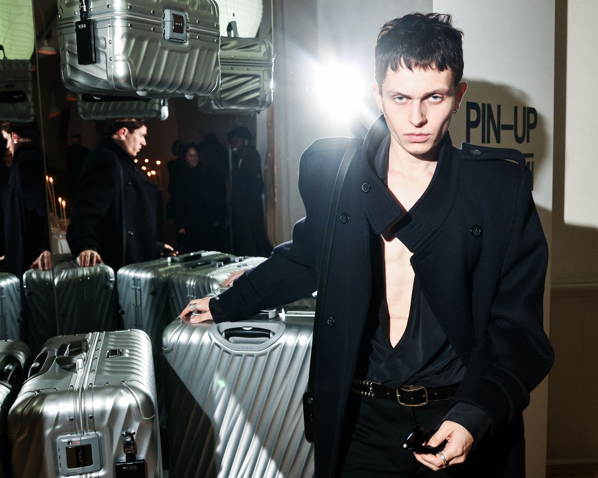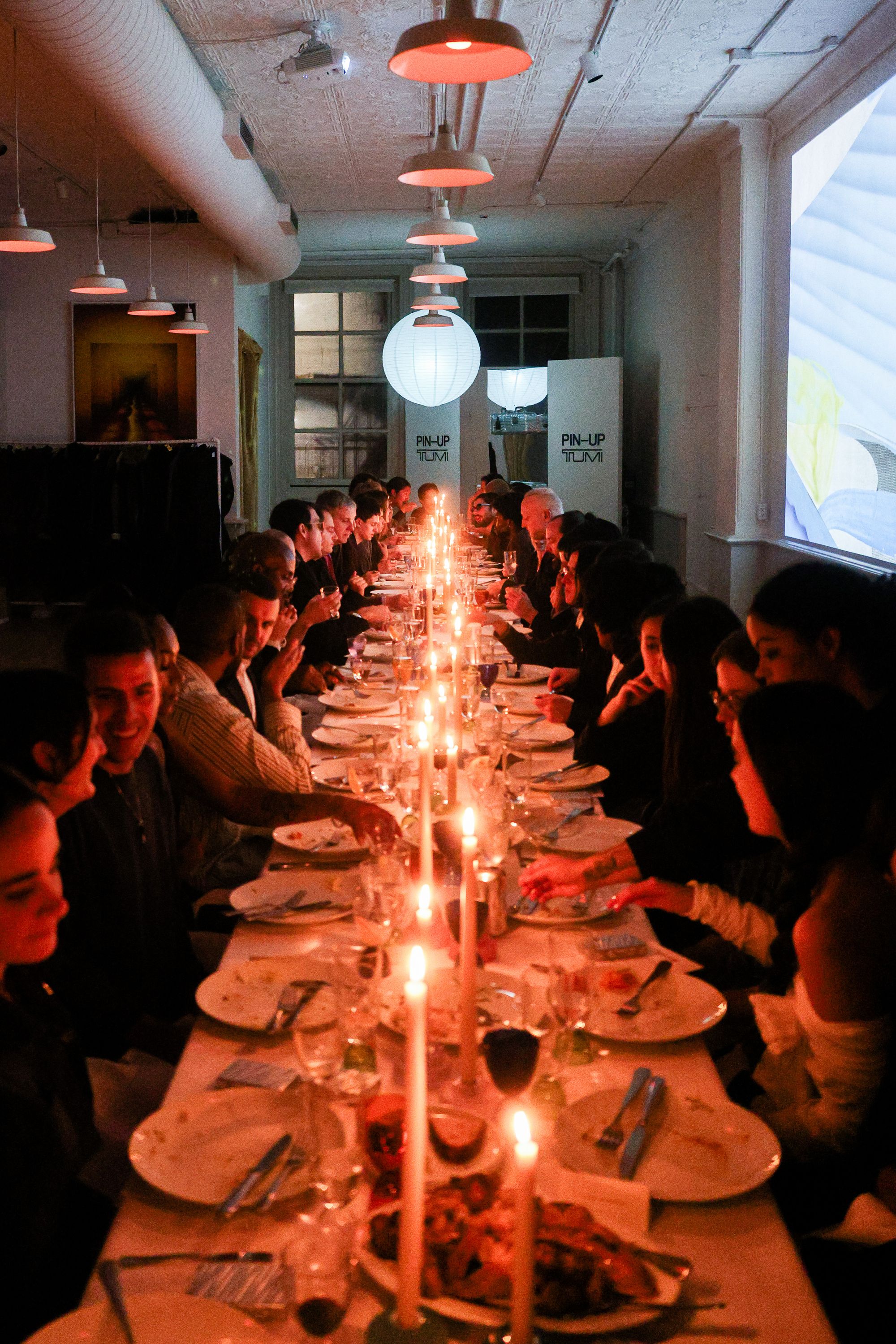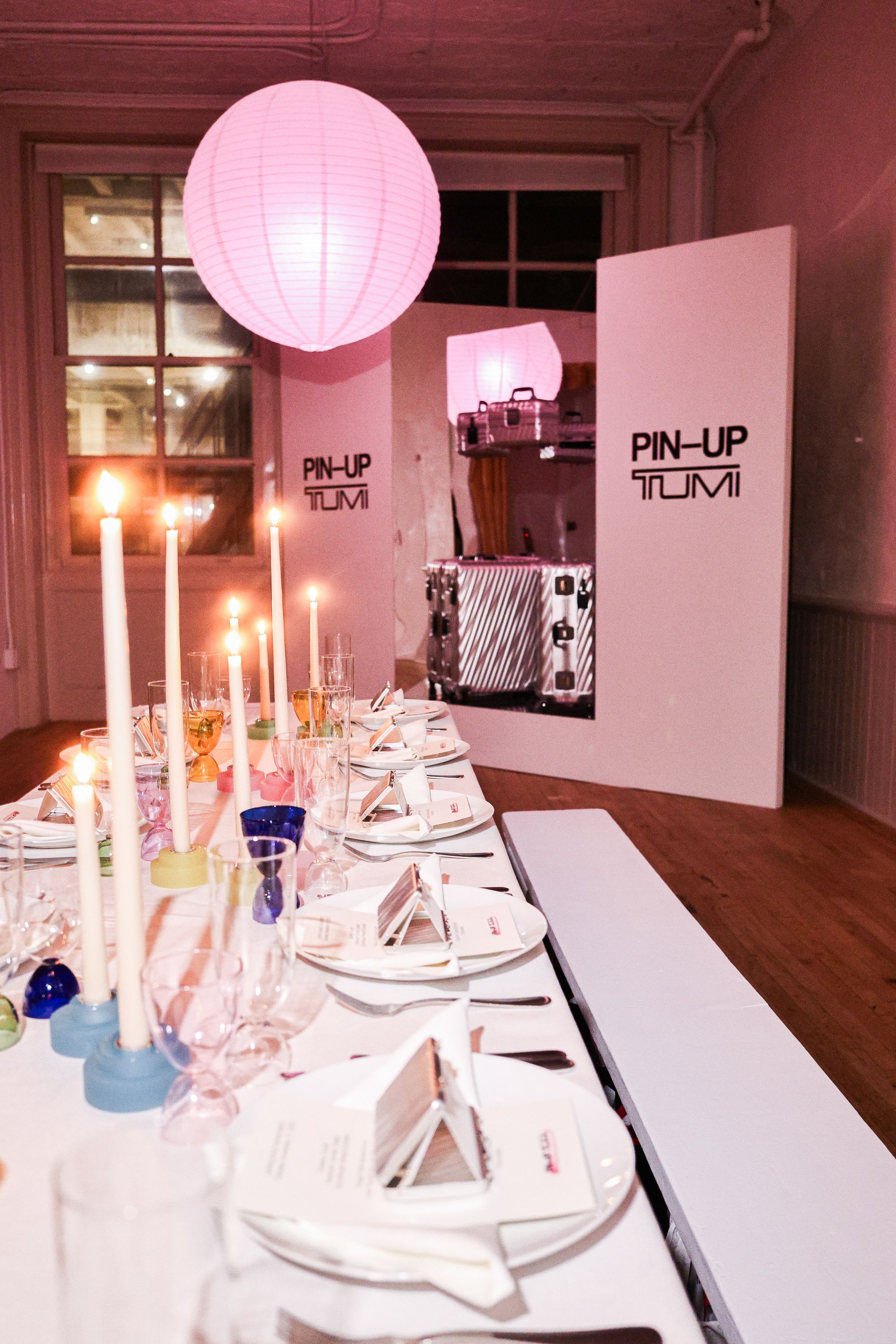 To celebrate the 50-year milestone, PIN–UP teamed up with TUMI for an intimate, 50-guest dinner at 102 Franklin in Tribeca. Guests stepped into an infinity-mirror installation that refracted TUMI’s 19 Degree aluminum collection into a shimmering totem — a playful nod to the infinite permutations of travel. Designed by Victor Sanz, TUMI’s creative director, the 19 Degree line has become one of the brand’s signature expressions, an object that feels as architectural as it is practical.